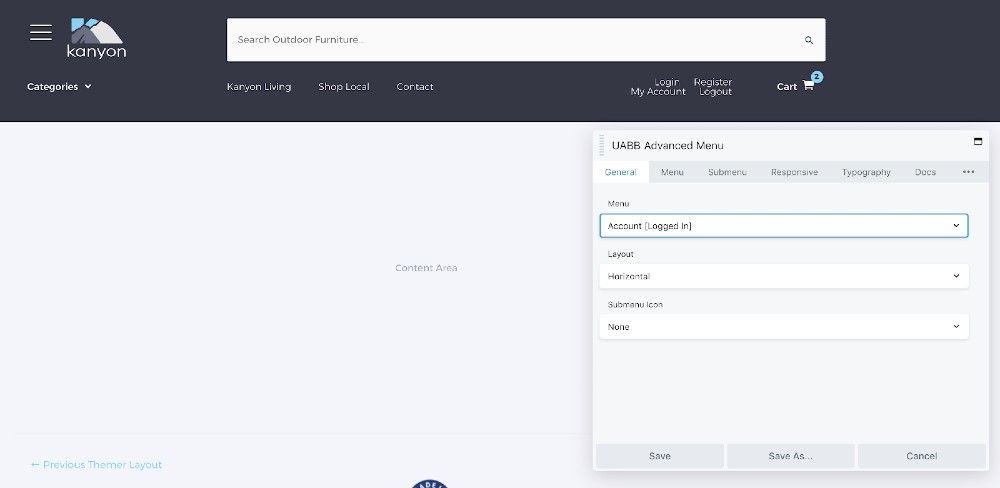 The site uses a UABB Advanced Menu to create a more dynamic menu that adapts to the user’s screen size, allowing them easy access to their account, cart, or more information about the brand.