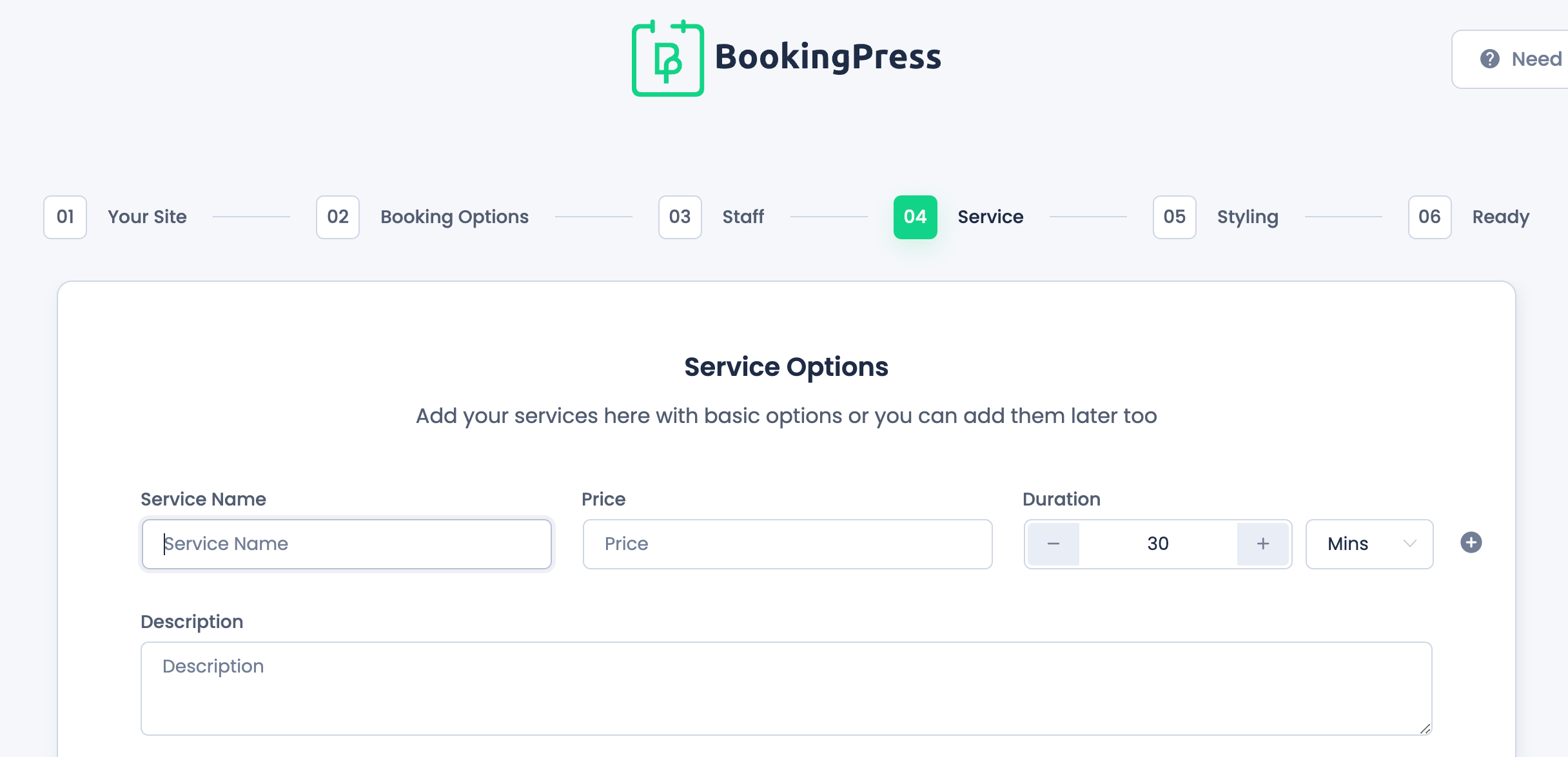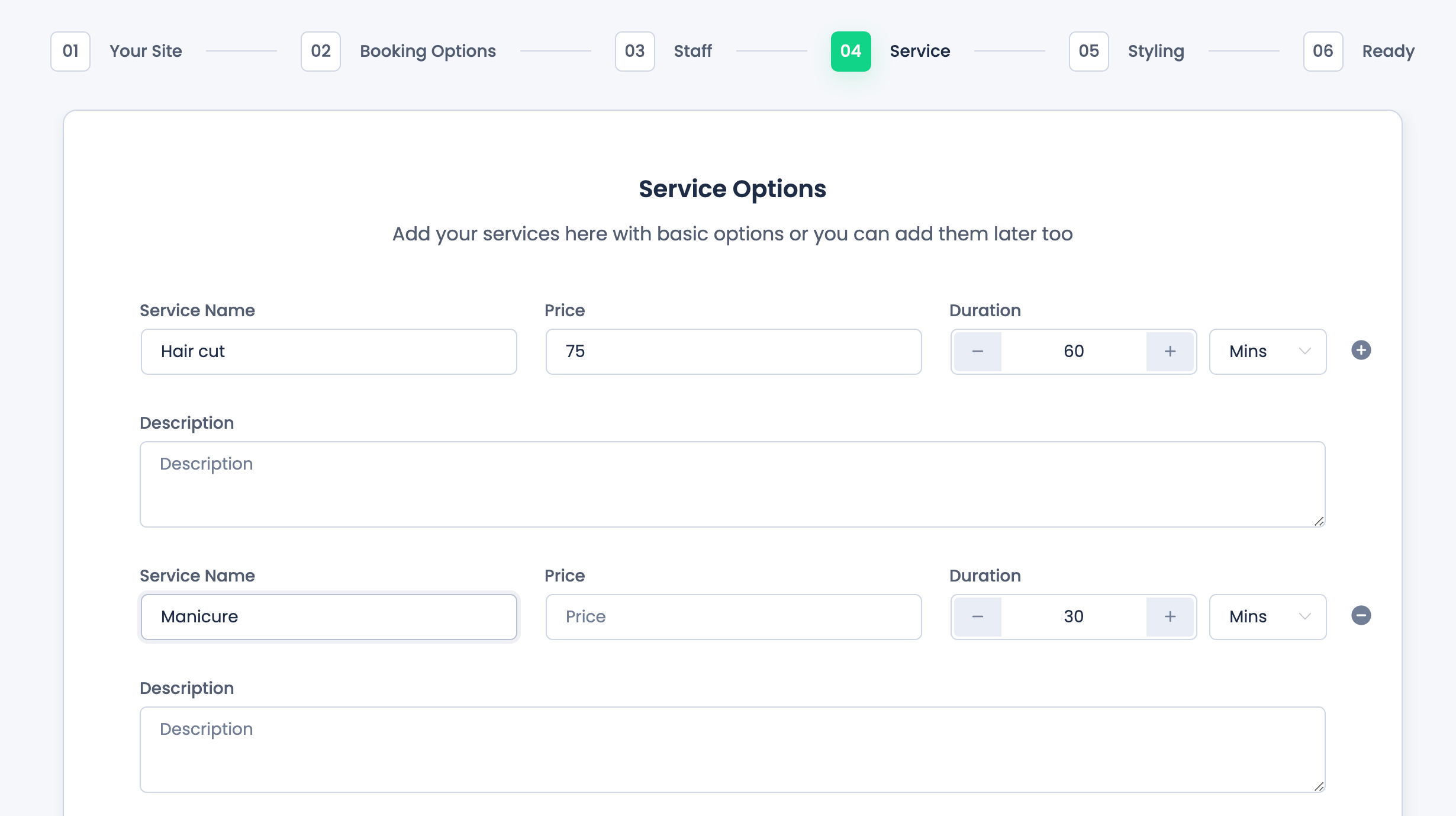 Next, you’ll describe the services you or your client offer, and set the price and duration for the sessions: