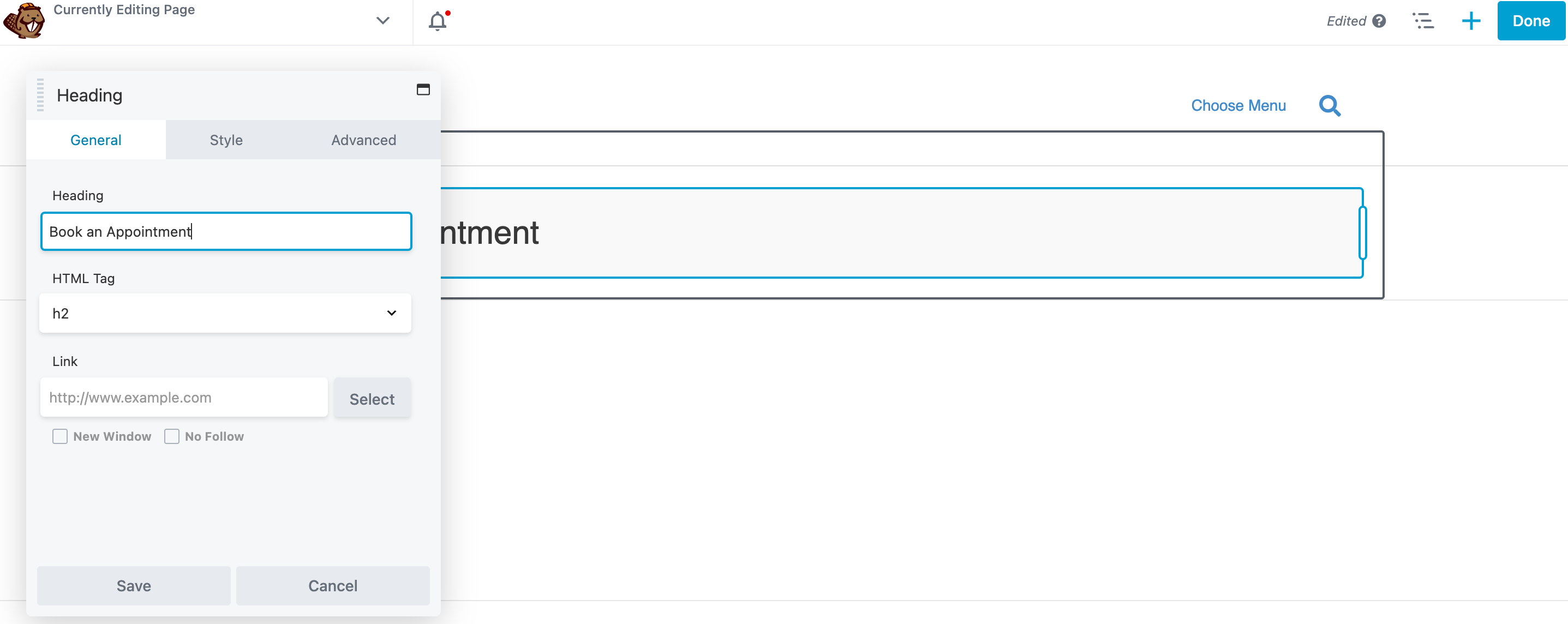 You’ll want to start by creating the website’s most important page – the booking page. You can do this however you’d like, but to keep things simple, begin by adding a Heading module with some descriptive text (such as “Book an Appointment”):