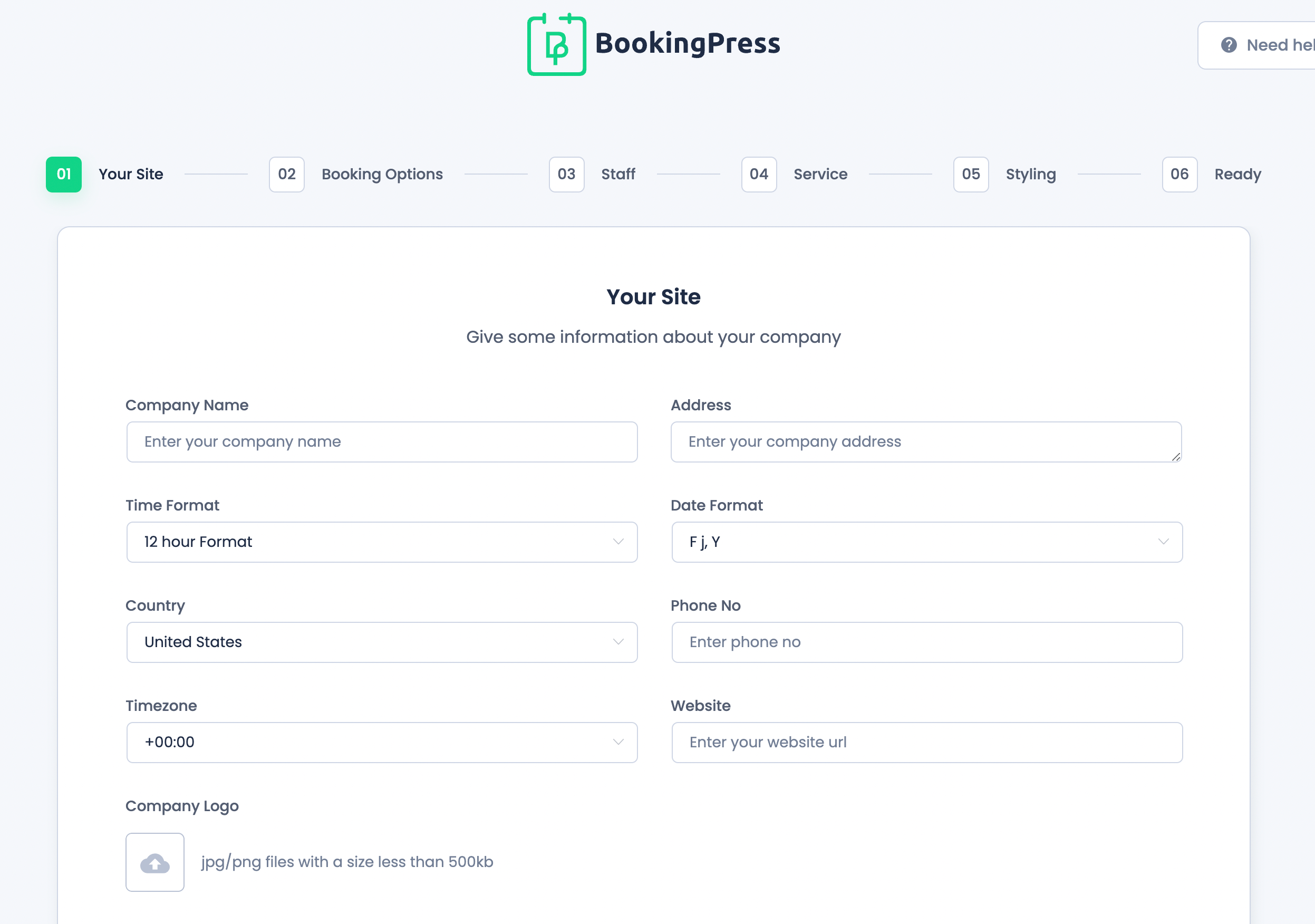 After that, you can add the company logo, website URL, and any other additional details you’d like to include. If you’re using the premium BookingPress plugin, you can indicate whether multiple team members will be using the booking system.