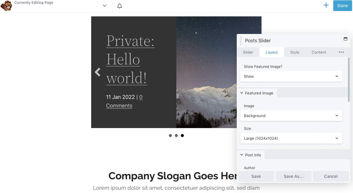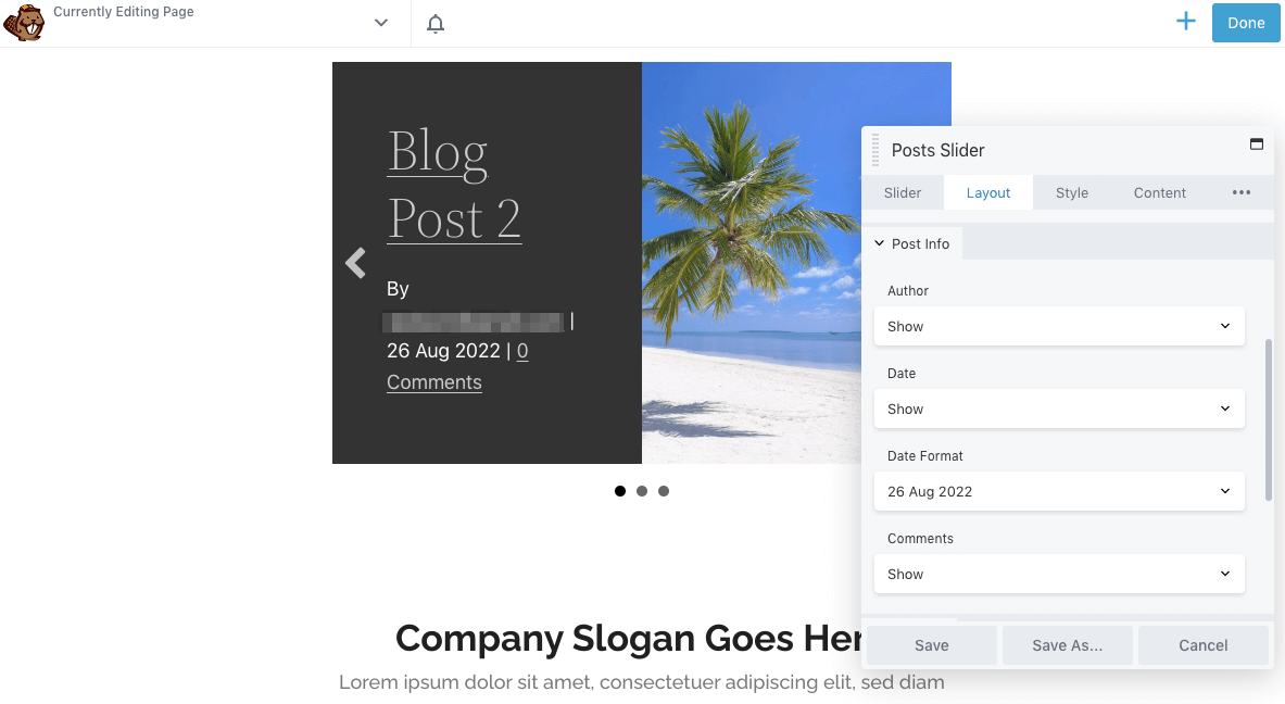 By default, Beaver Builder will include the post’s featured image in the slider. In the Layout tab, you can edit the size of this image or remove it altogether: