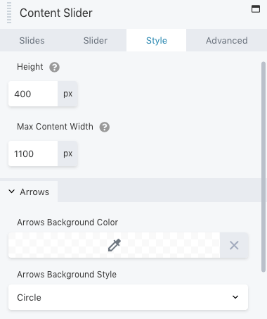 Under Style, you can adjust the height and width of the content slider. Additionally, you can edit the arrows’ color and style: