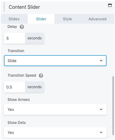 As you scroll down, you can set a transition speed and the number of posts in the slider. Then, choose whether to display dots and arrows: