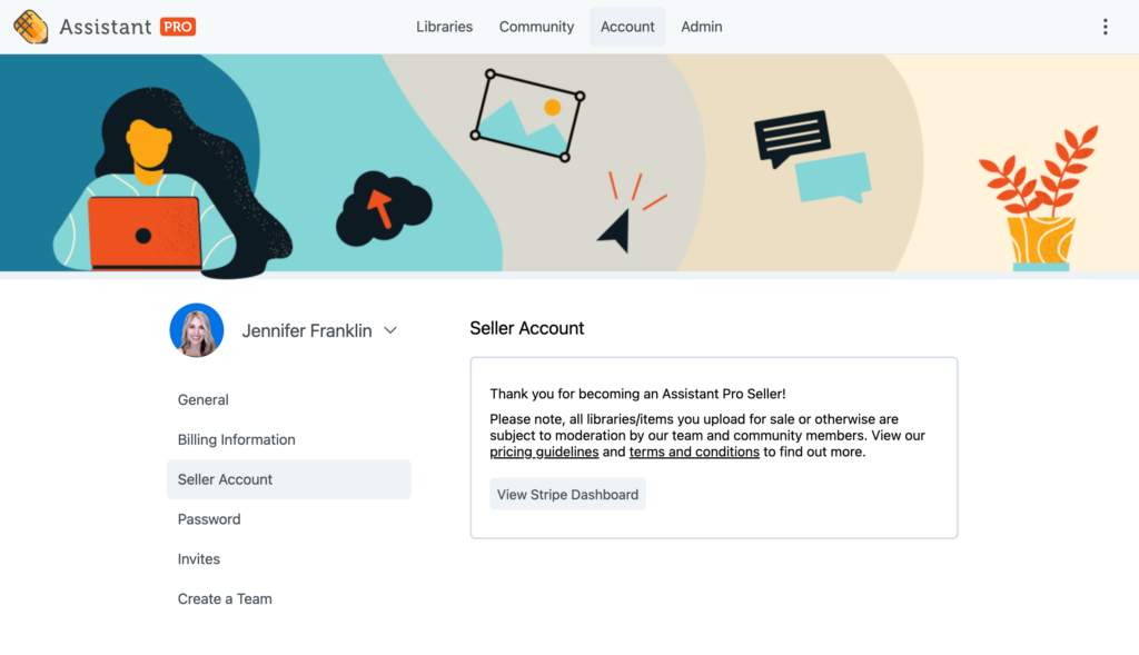 Both Personal and Team account users can utilize the Assistant Pro Community to monetize their design libraries. Free account users are also part of the Assistant Pro Community but need to upgrade to a Personal or Team account to access the Seller feature: