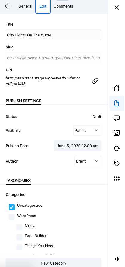 Under the Edit tab, you can change some of the page’s basic information. This includes the title, slug, publishing settings, author, categories and tags, featured image, and so on.
