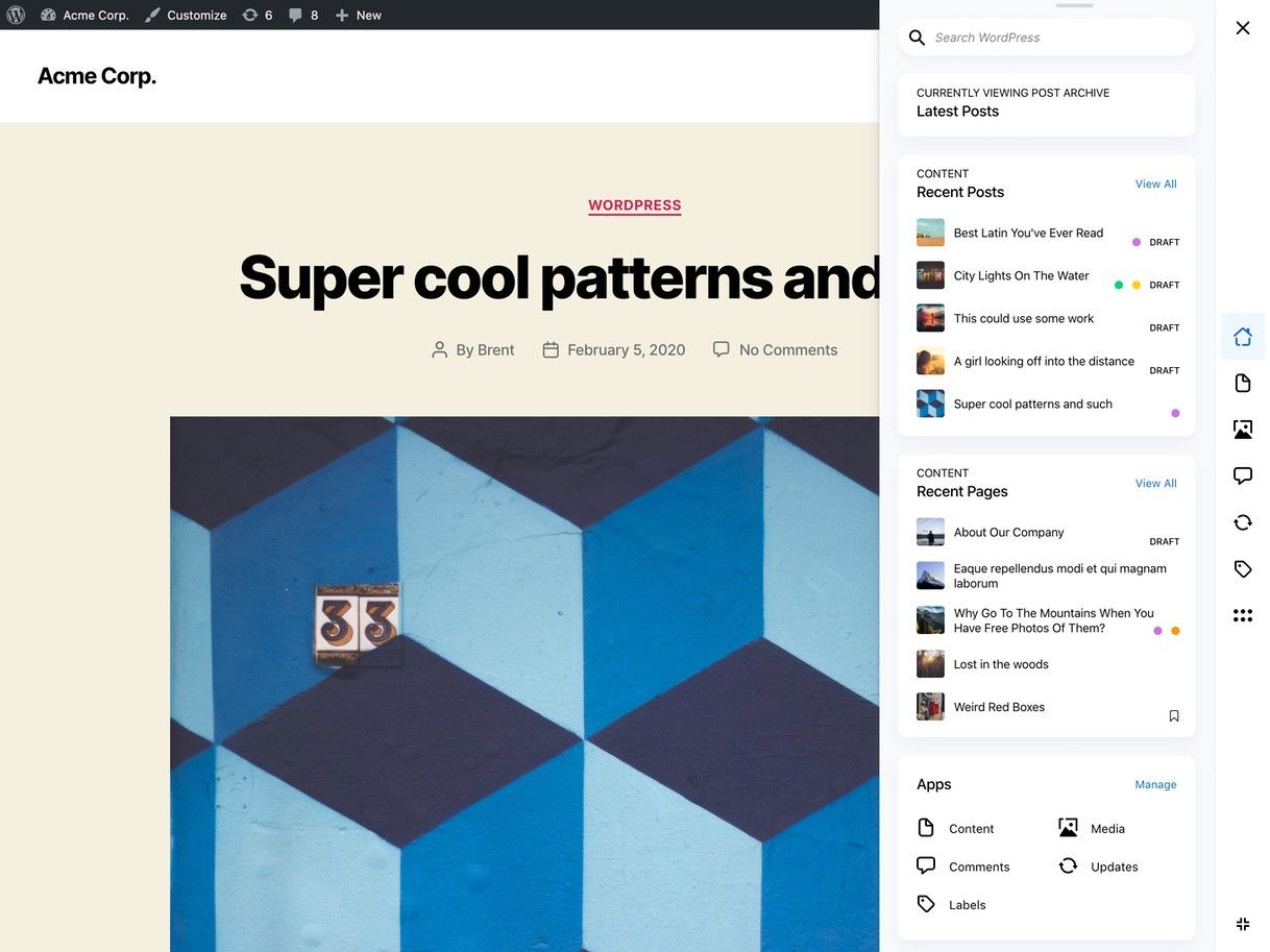 This handy productivity tool helps you quickly accomplish all kinds of tasks on the front end of your site, such as reviewing new content and comments, uploading media, and much more.