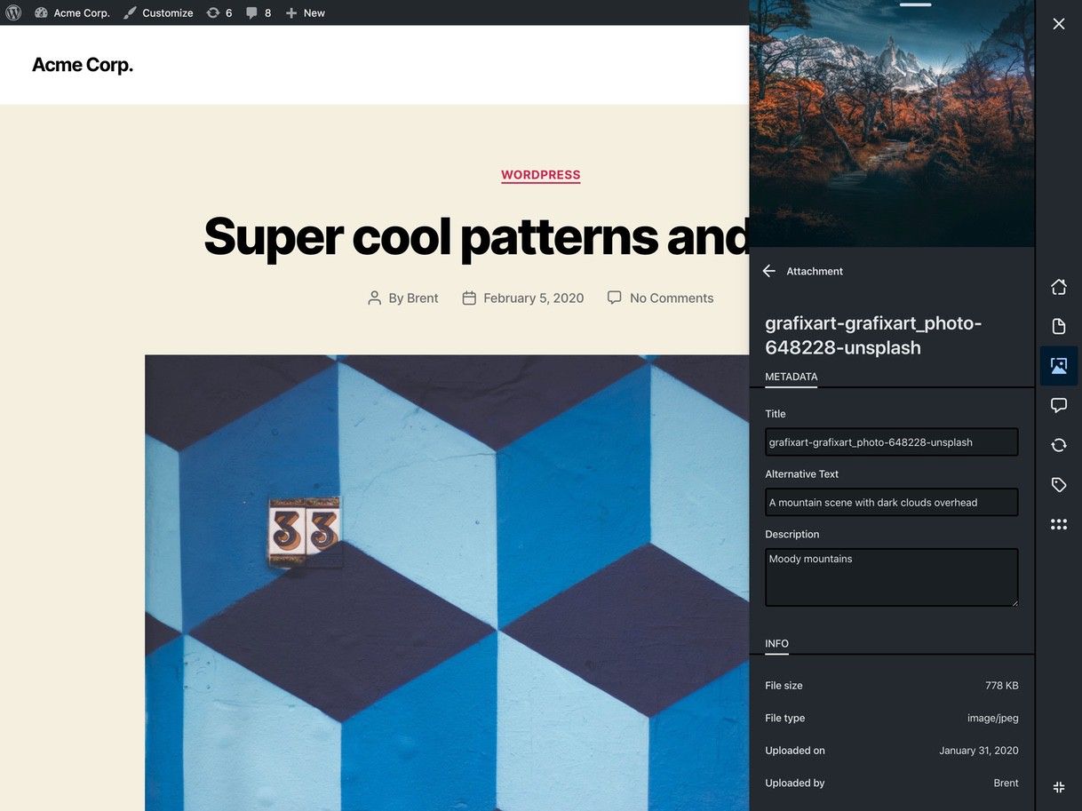 You can also view any links that are associated with it, and edit its title, alt text, and description: (See example dark version below)
