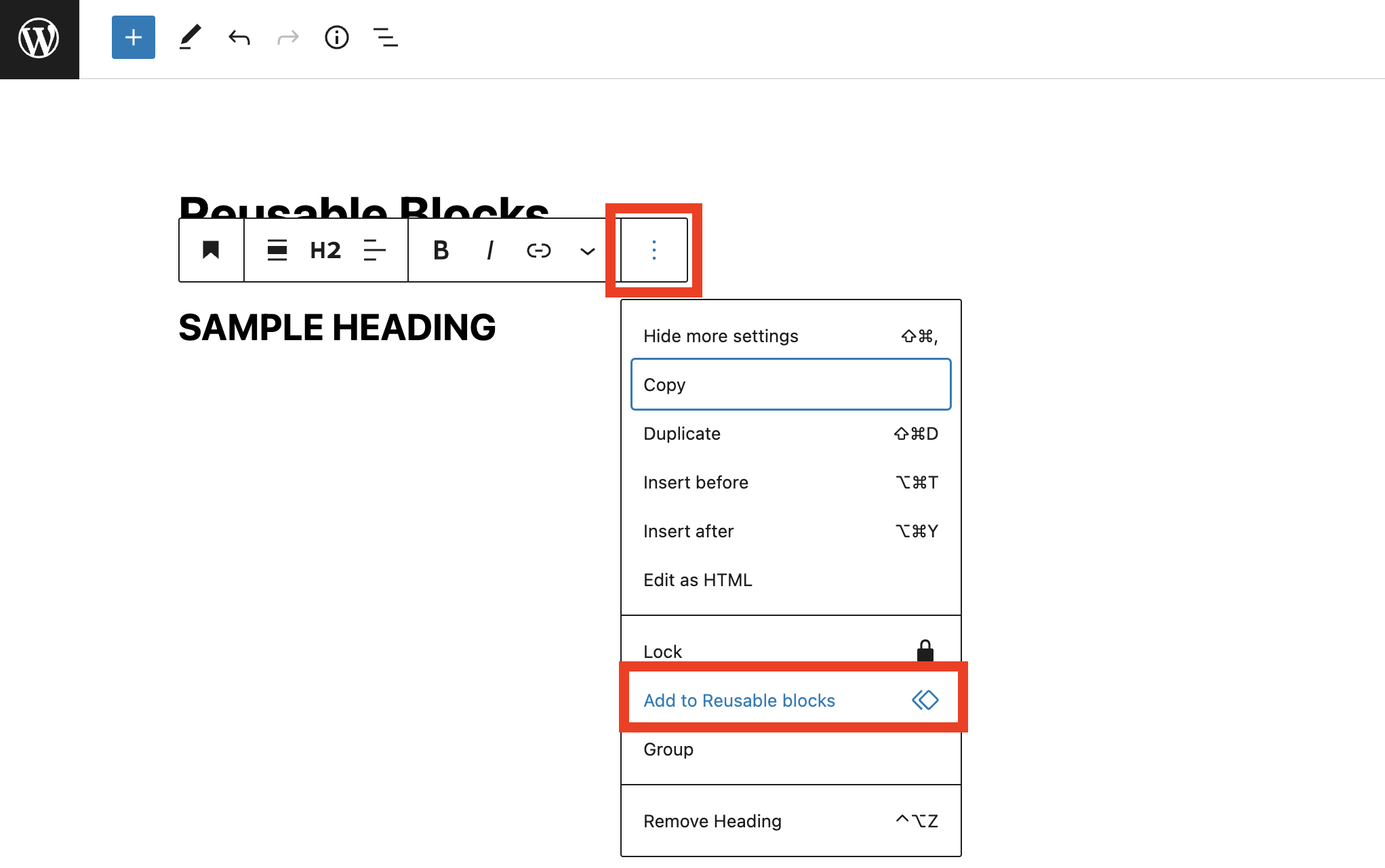 To create reusable blocks in WordPress, first select the element or elements that you want to turn into a reusable block. Click on More options on the far right side of the pop-up menu, and select Add to Reusable Blocks. Then just name and save the new element to add it to your reusable block repository:
