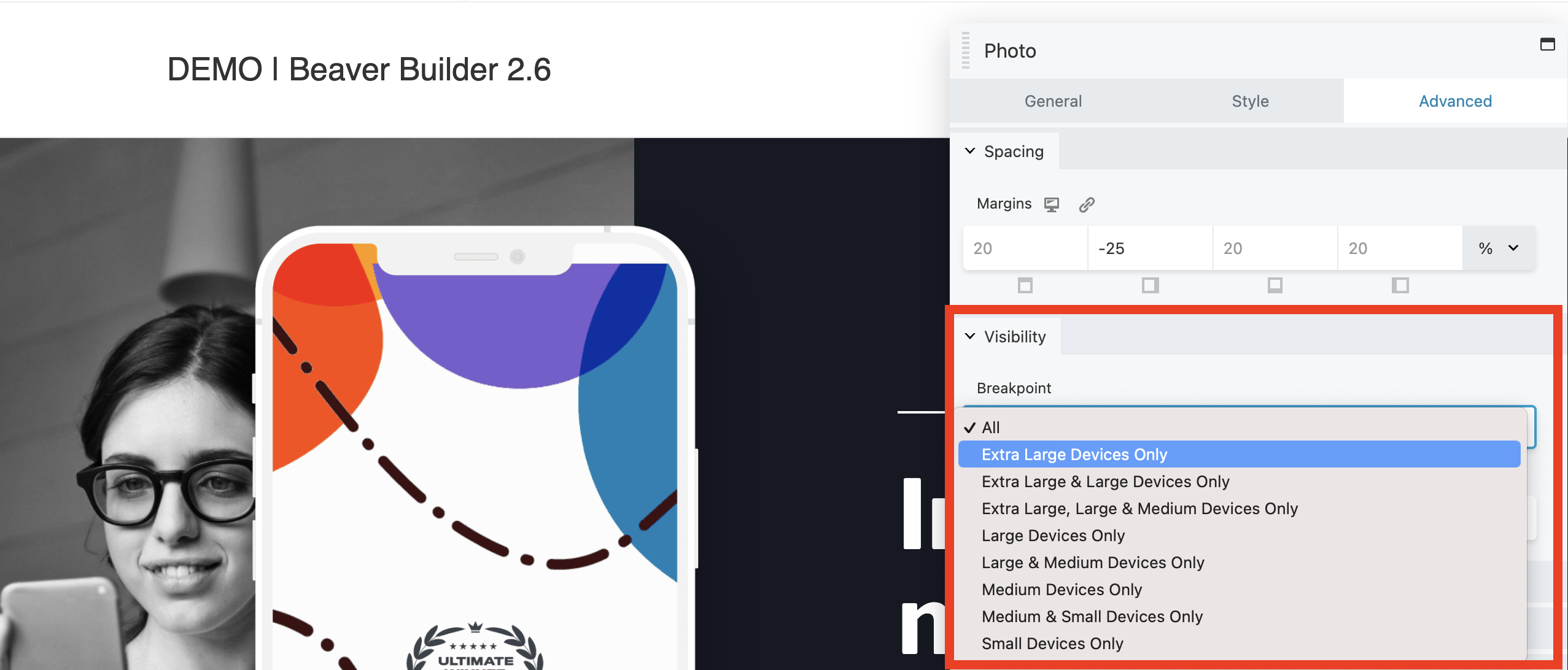 This means that there is now a category larger than the Large Device breakpoint, which is called Extra Large Devices. You can see this selection listed in the Breakpoint setting in the Visibility section located under the Advanced tab of rows, columns, and modules: