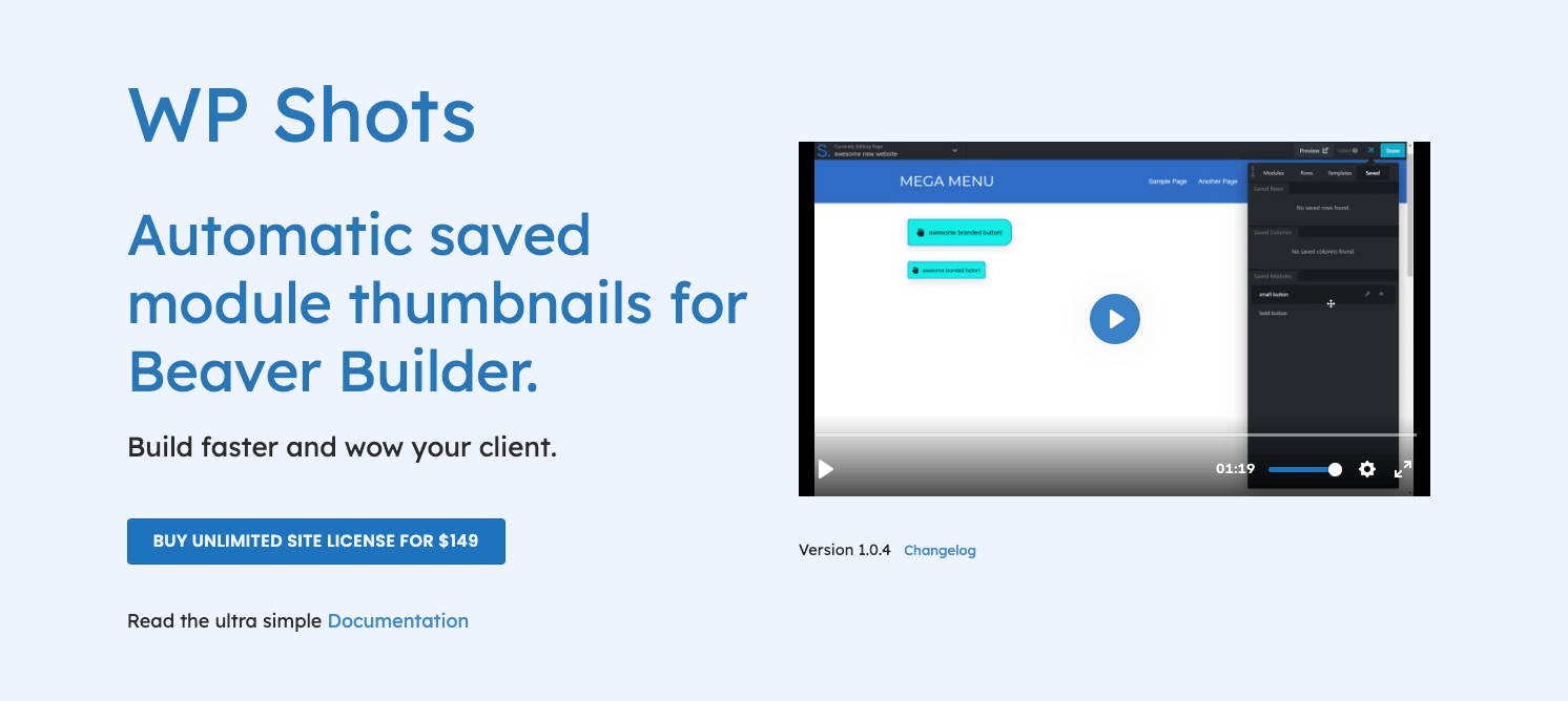 WP Shots allows you to save module thumbnails for Beaver Builder automatically so you can build even faster. It screenshots all of your saved templates, rows, columns, and modules every time you save or update.