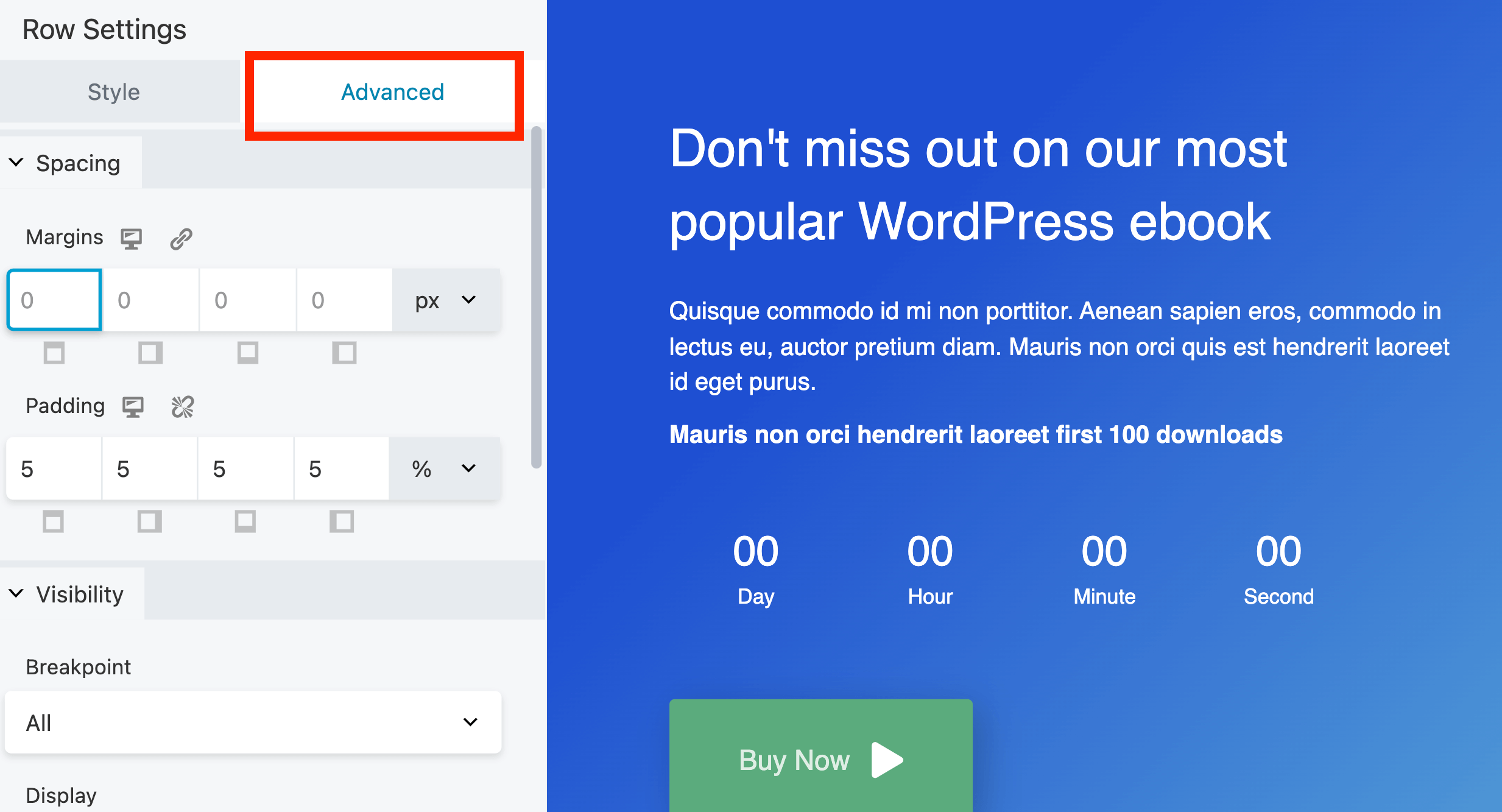 Click on whichever element you’ve chosen as the destination. For this example, we have selected the Row as the target destination. In the Row Settings popup, select the Advanced tab: