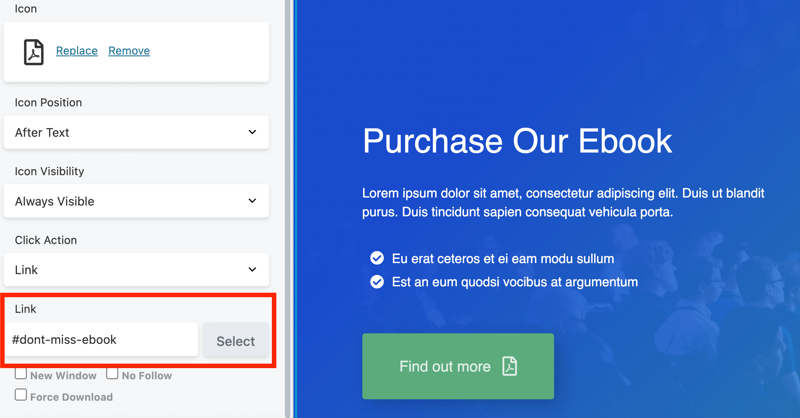 Next, go to the editor box. Under the General tab, you’ll see a field labeled Link. Here, you’ll need to insert the same unique ID and add a hashtag in front of it. In our example, it would be #dont-miss-ebook: