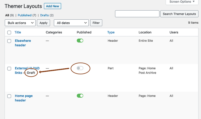 As you can see in this screenshot, it’s a one-click toggle to unpublish the layout: