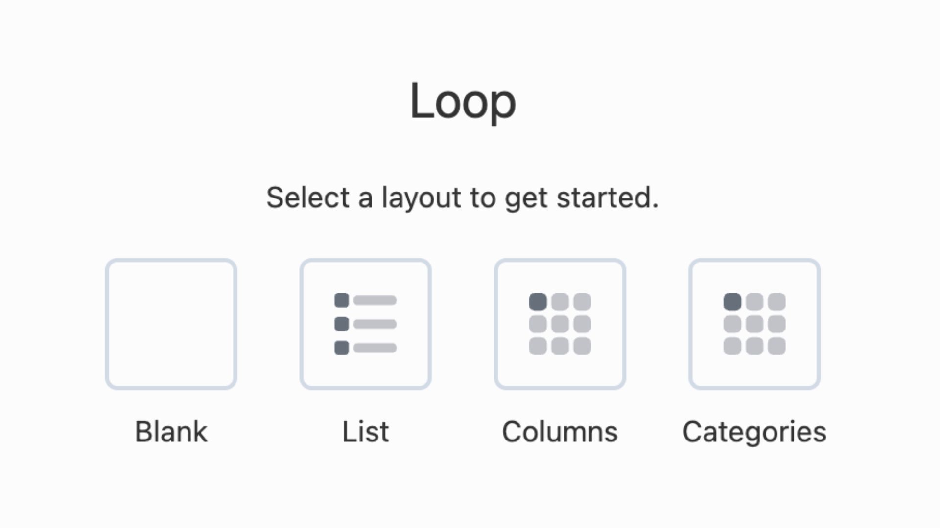 When you first drag the Loop module onto your page, you’ll be prompted to choose from the following preset layouts: List, Columns, Categories, and Product Categories.