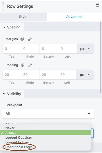 Also, with Beaver Themer installed, these conditional logic settings are available as an extra choice in the Display setting on the Advanced tab for individual rows, columns, and modules in any Beaver Builder layout:
