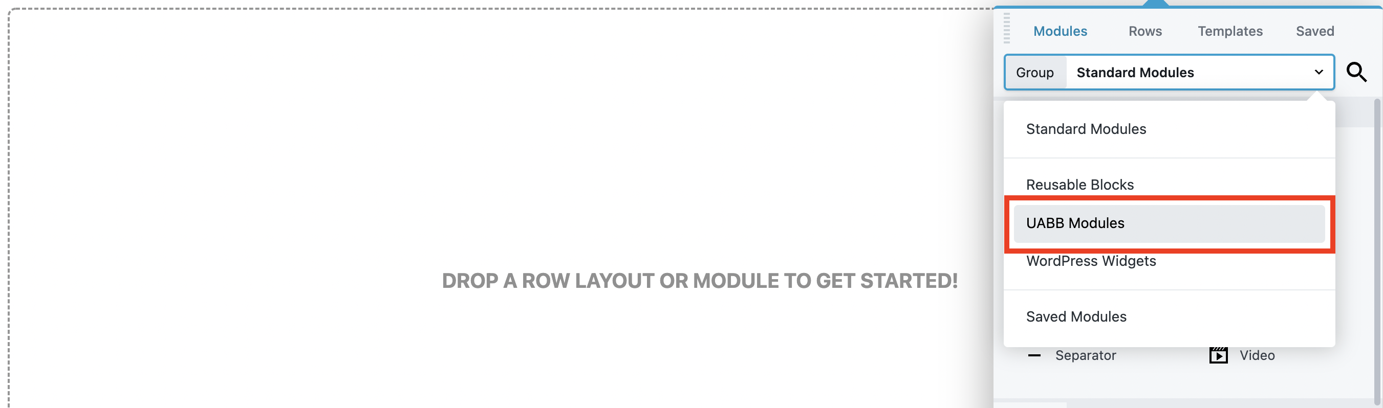 Once you’ve activated the plugin, you can open your page in Beaver Builder and access the modules as you normally would. In the Group drop-down, you need to switch from Standard Modules to UABB Modules and select Star Rating: