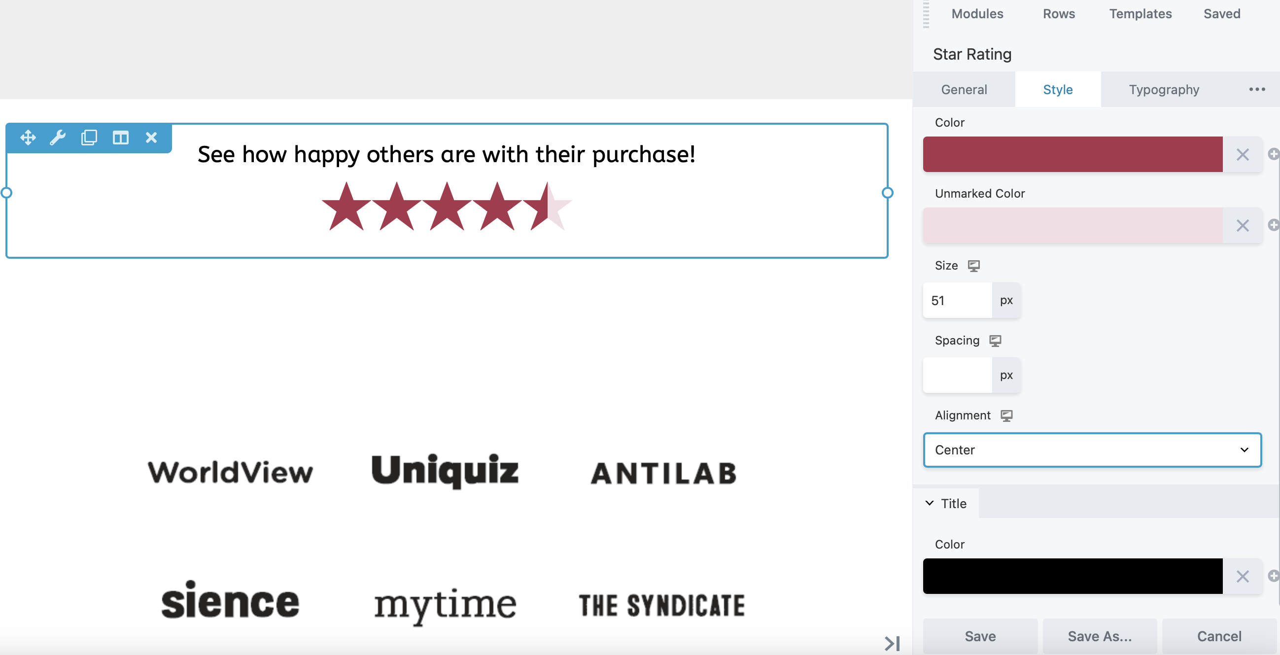 In the General settings, you can choose between a five and ten-star rating, give your ratings a title, and more. If you navigate to Style, you can apply custom colors, and alter the size and alignment of your module: