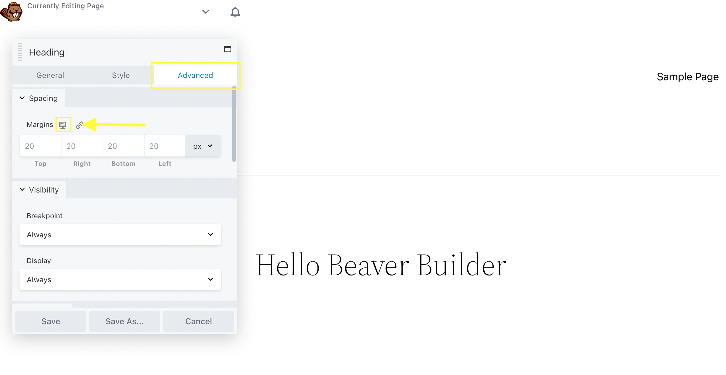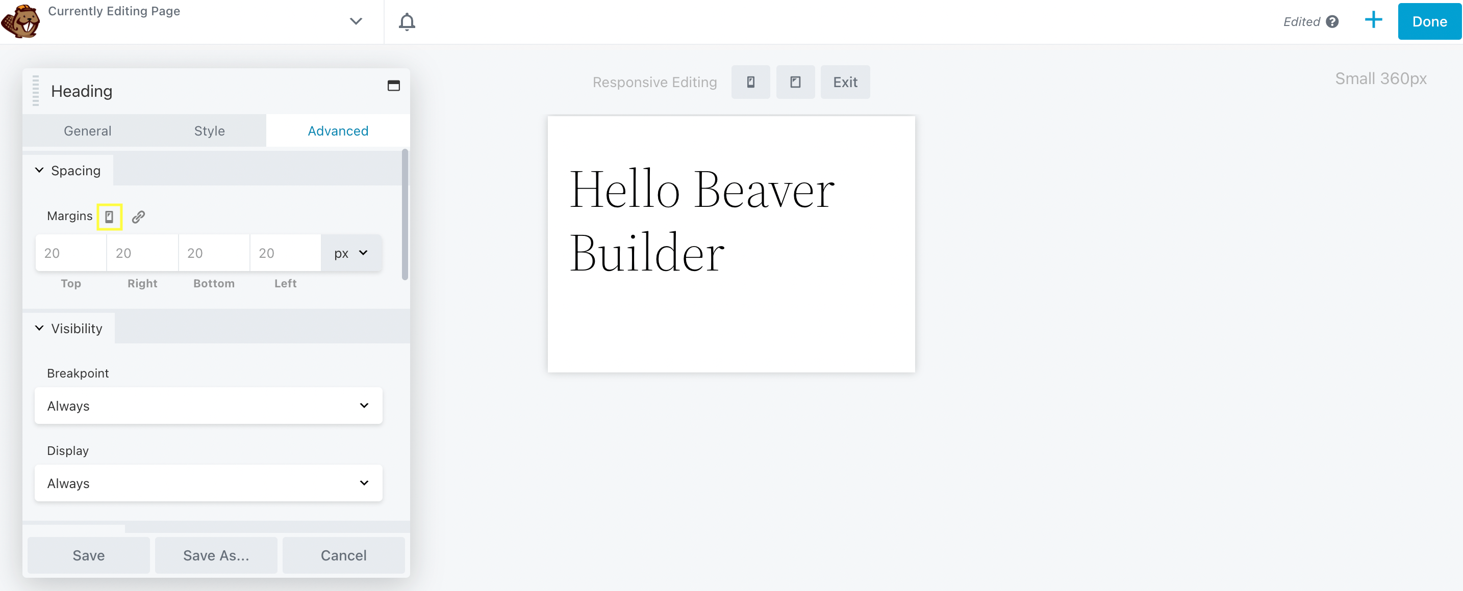 Beaver Builder's mobile responsive icon in the advanced tab