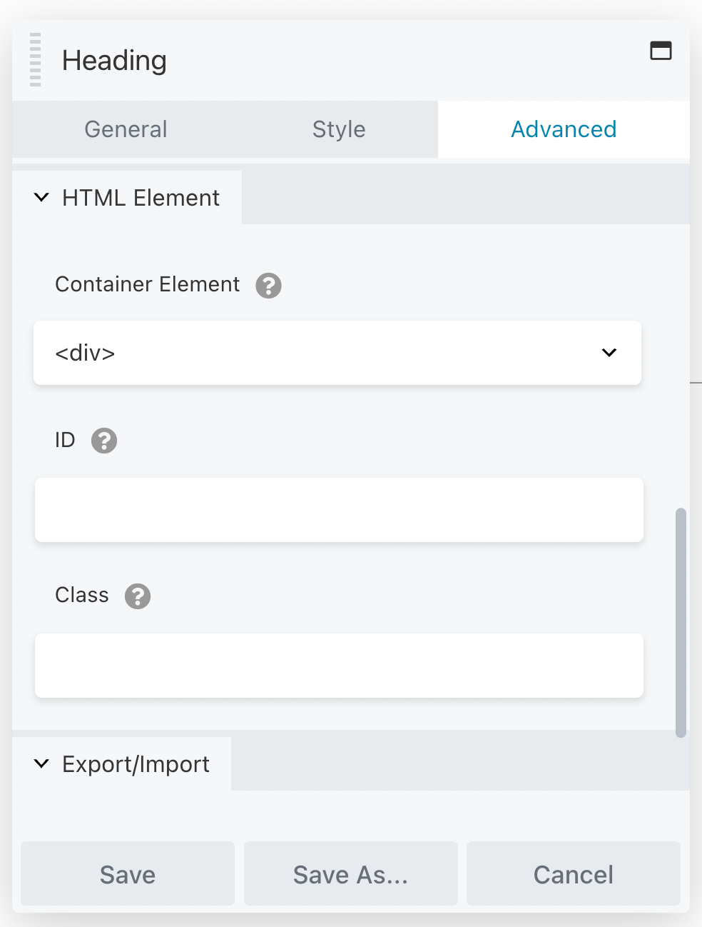 If you would like to make your headings even more accessible, you can take advantage of the Advanced settings in the Heading module. When you click on this tab, scroll down to find the HTML Element section: