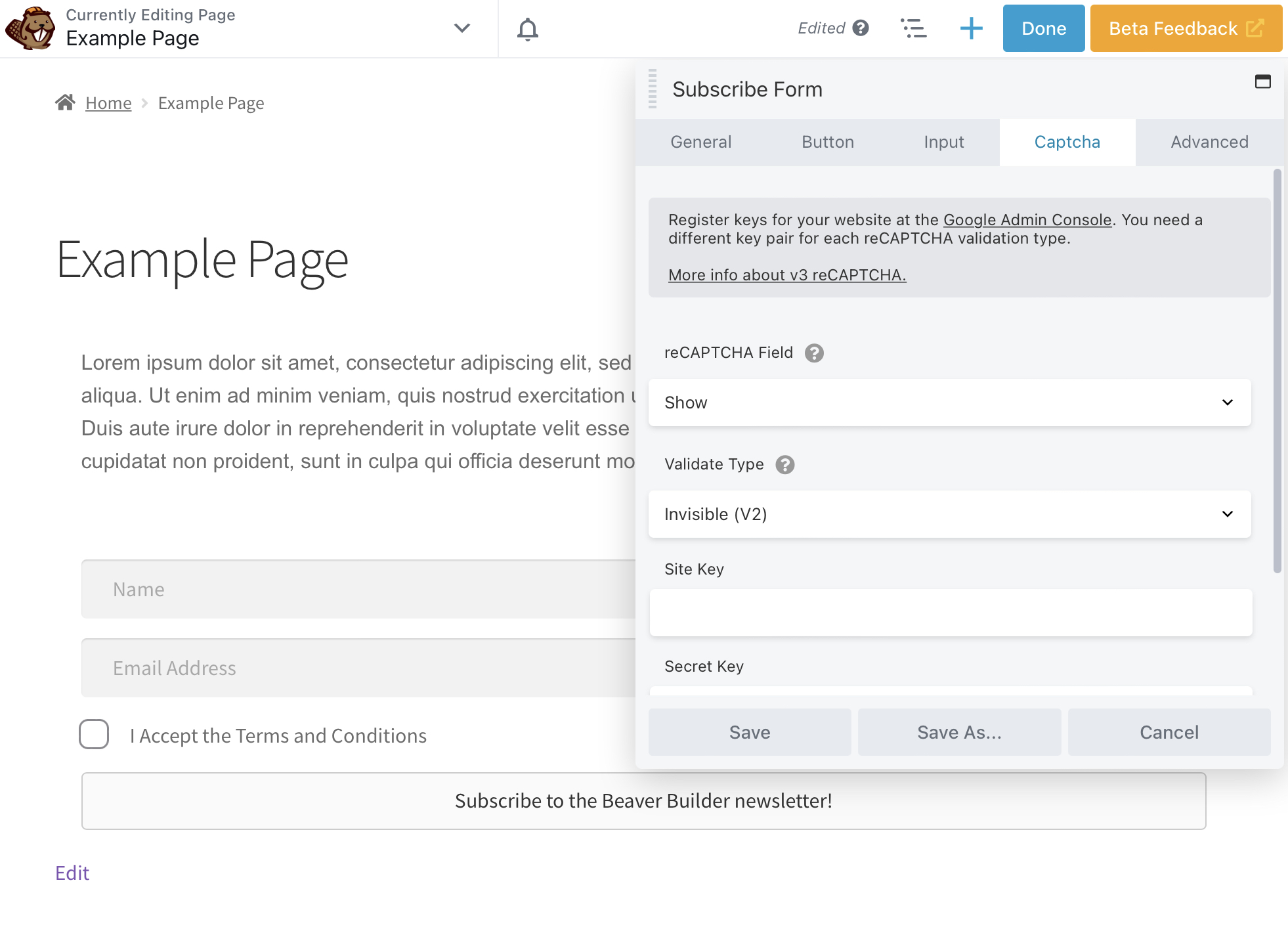 Then select your Validate Type and enter your Site Key and Secret Key. You can create these keys through Google’s reCAPTCHA generator.