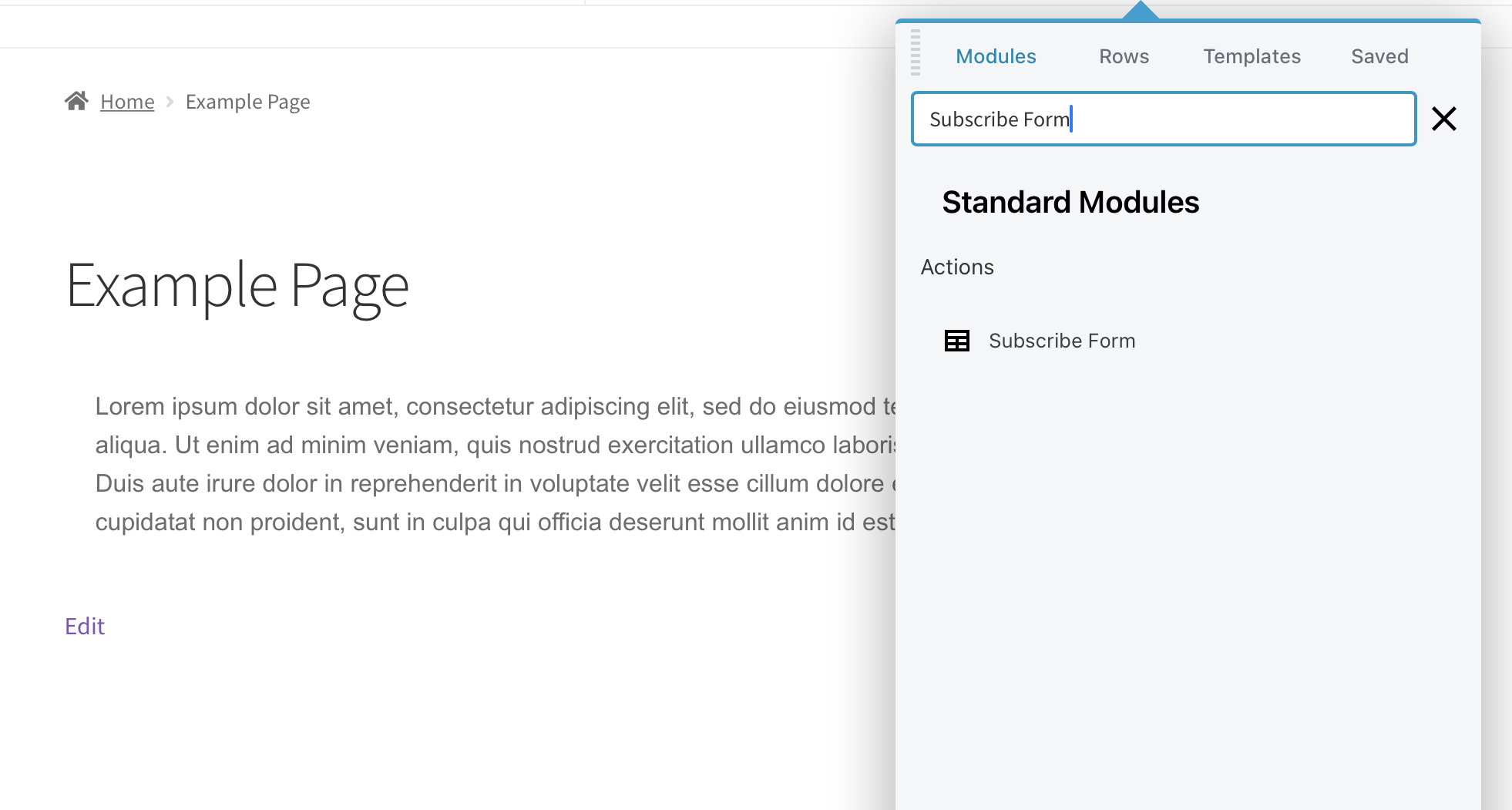 Our example page has a Text module. We’ll place our Subscribe Form Module below this: