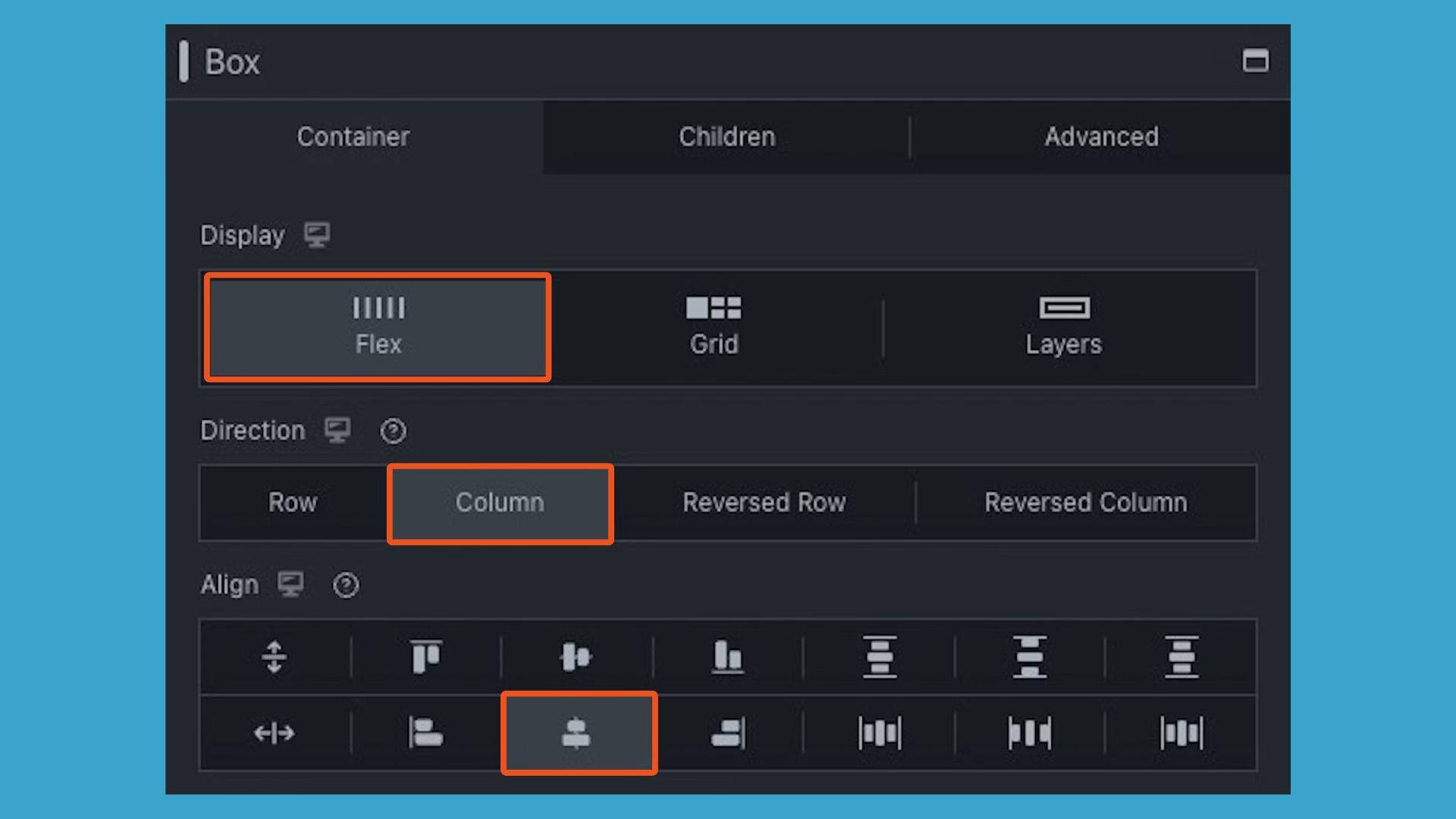 We’ll use the Box module as our container because it’s the most flexible modern module for structuring Components. Set it to a flex-direction of column and align-items of center: