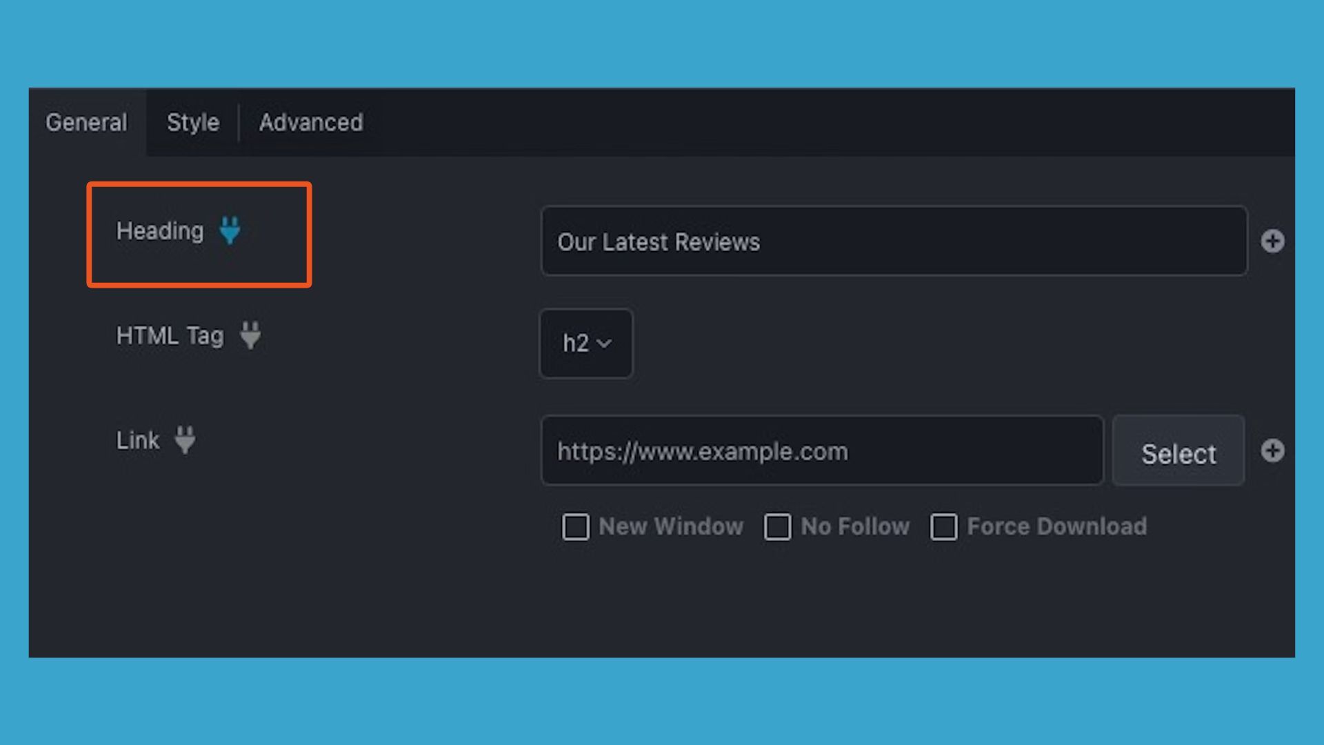 For our Section Intro Component, click the plug icon next to the Heading module’s text field. It should turn blue, indicating this setting is now editable. Do the same for the Text module’s WYSIWYG content and the Button module’s text and link fields: