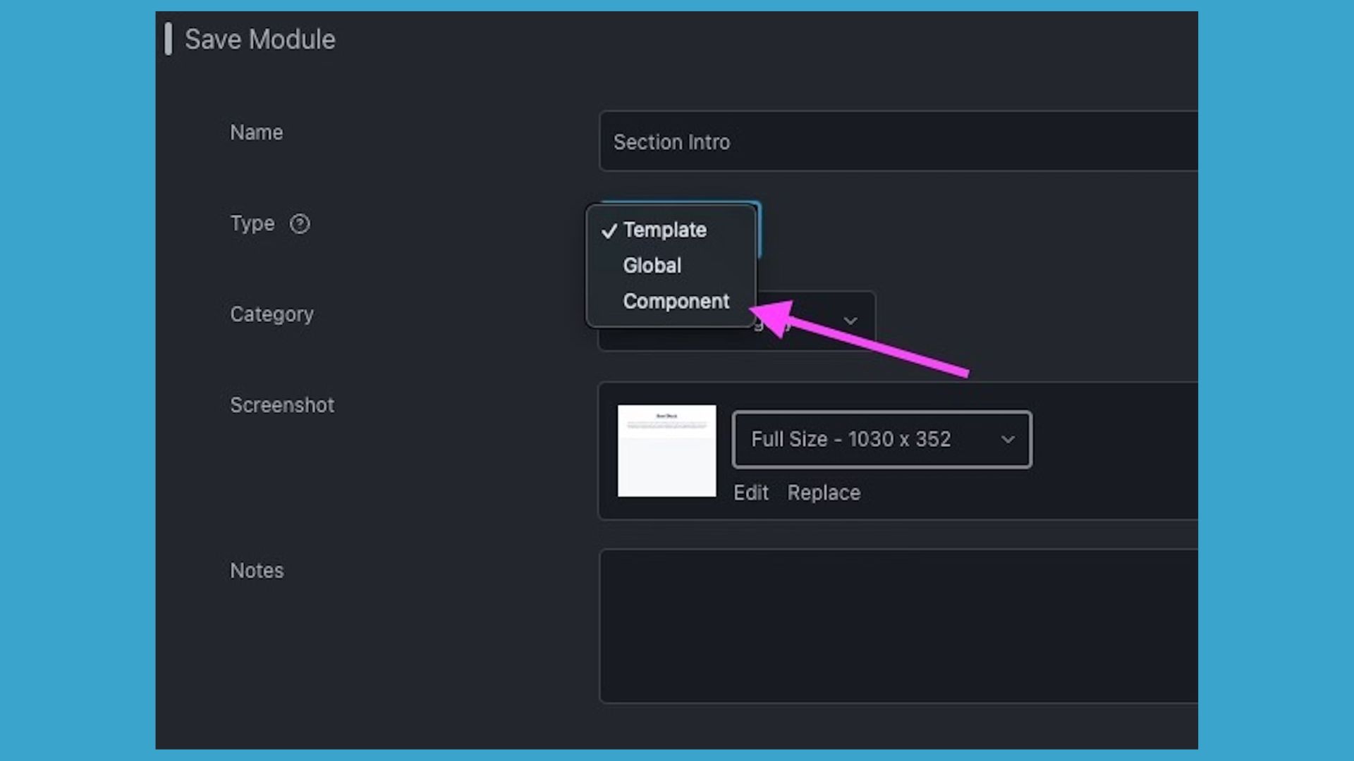 In the save dialog, give your component a descriptive name like “Section Intro,” select “Component” from the Type dropdown, and optionally add a category for organization and upload a screenshot. This screenshot will show in the Saved list, making it easy for you to identify which component you want to use in the future: