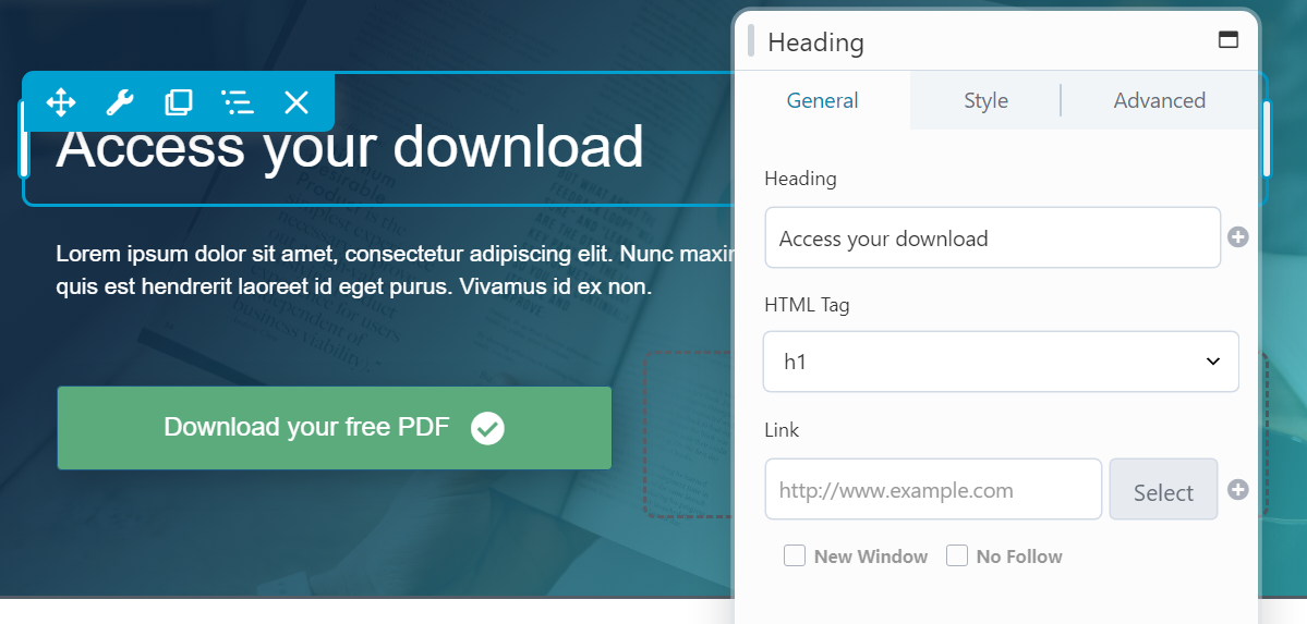 Next up, we’ll add a Call-to-Action (CTA) using the Heading module. In our case, we’re using a simple prompt that says “Access your download”: