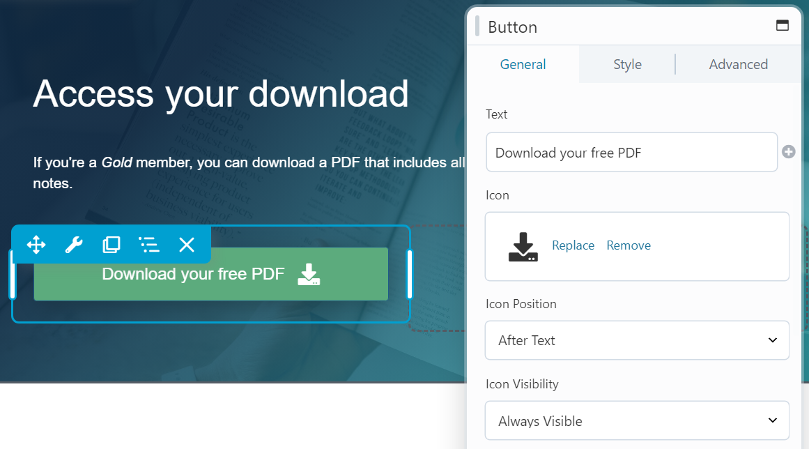 Next up, we have the actual download button. The Beaver Builder Button module enables you to customize the style of the element. You can even include an icon inside the button: