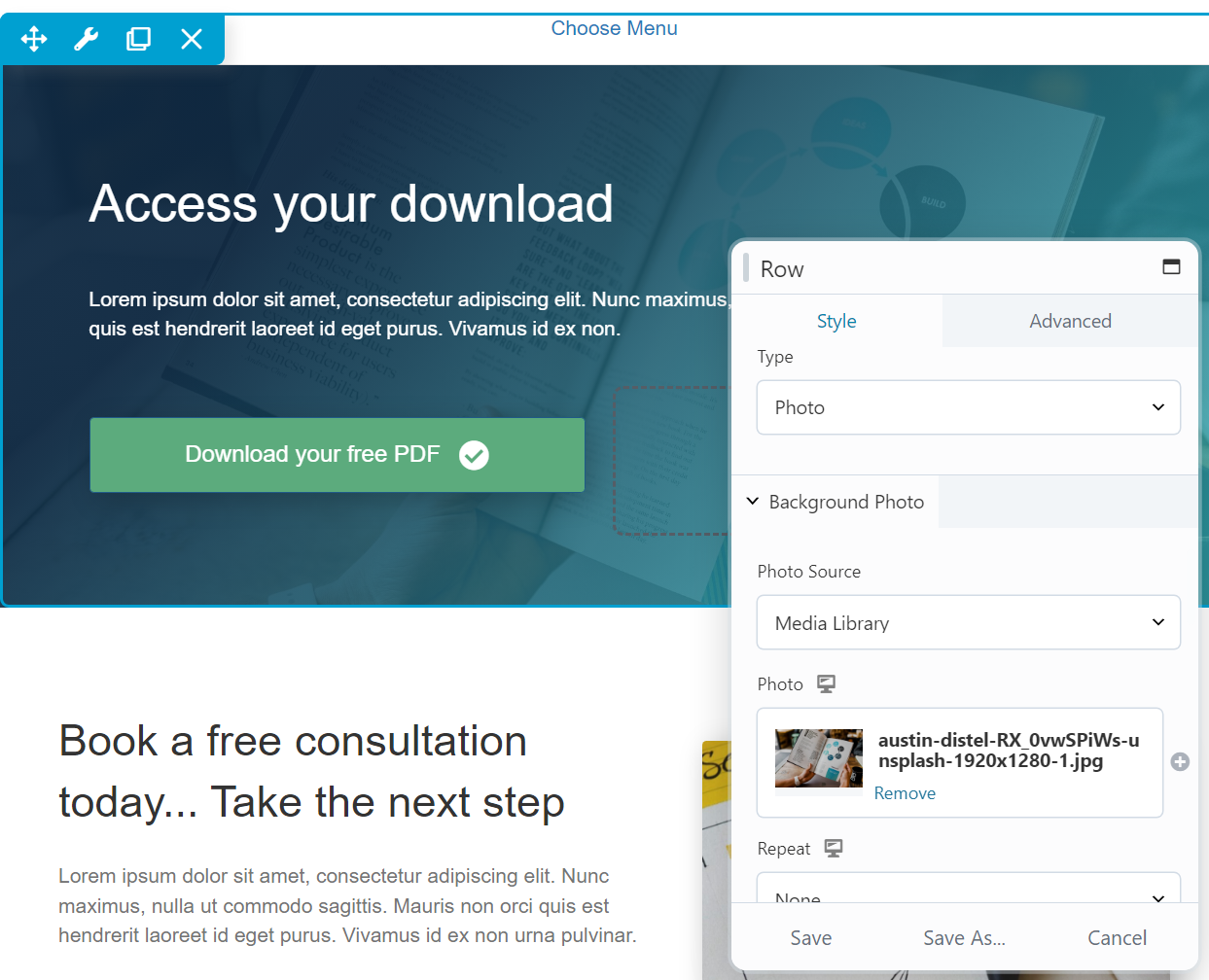 To start, we set up a large hero section with an image background. This is a simple full-width row using the Background Photo option that you can access if you click on the element to modify its settings: