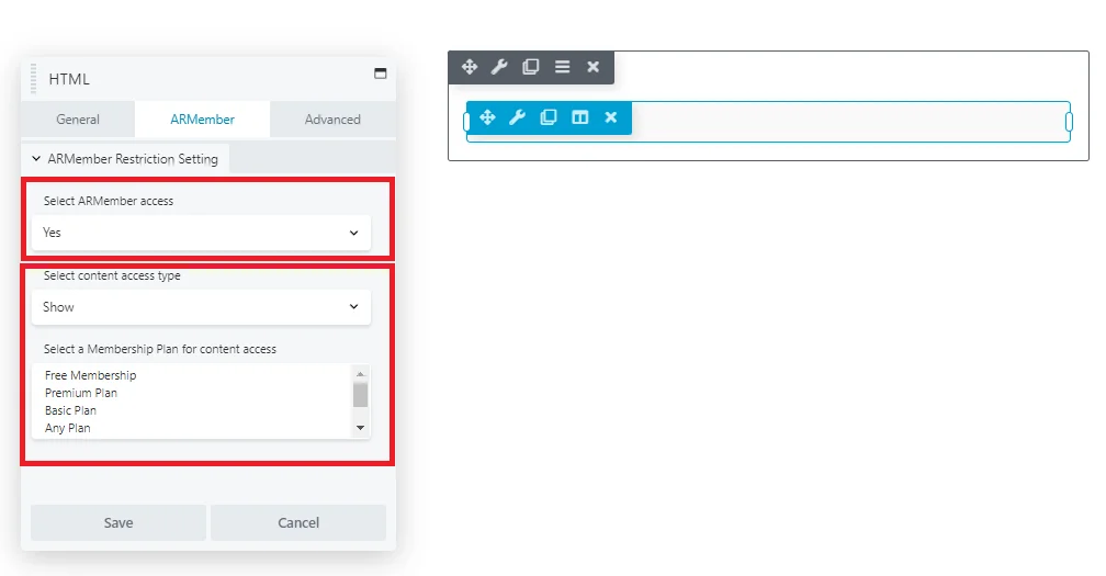 You can see these options by selecting a module, going to its settings window, and navigating to the ARMember tab. This tab will give you the option to restrict content for specific sets of users in WordPress: