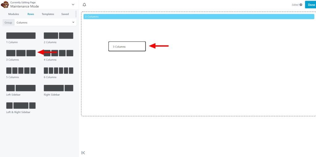 First, add a three-column row on your page. In the Content panel, click the Rows tab and drag the three-column selection into your layout.