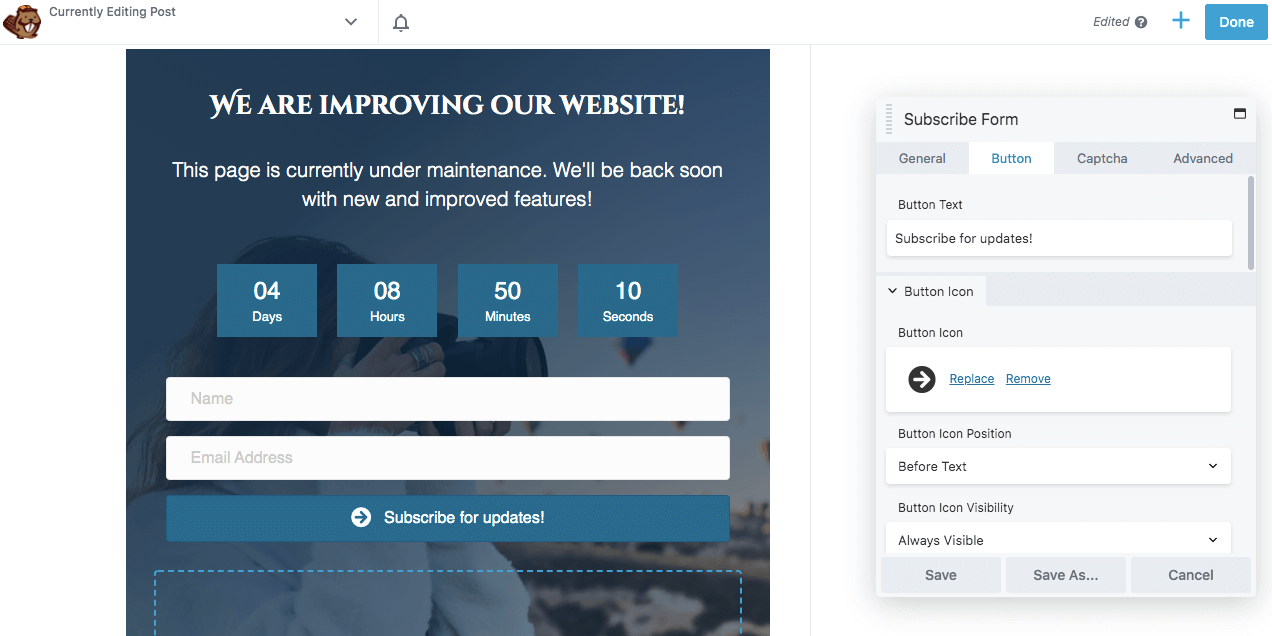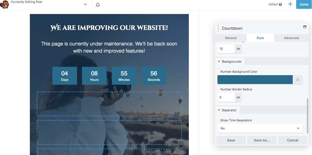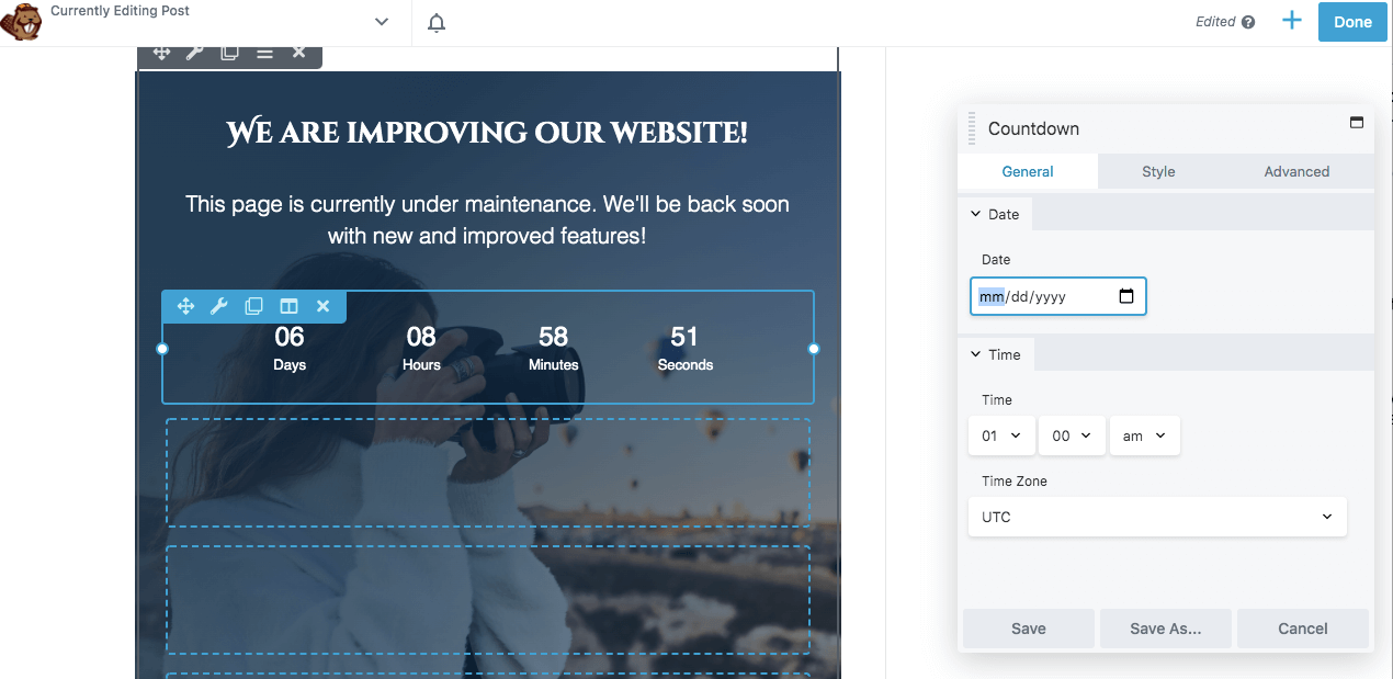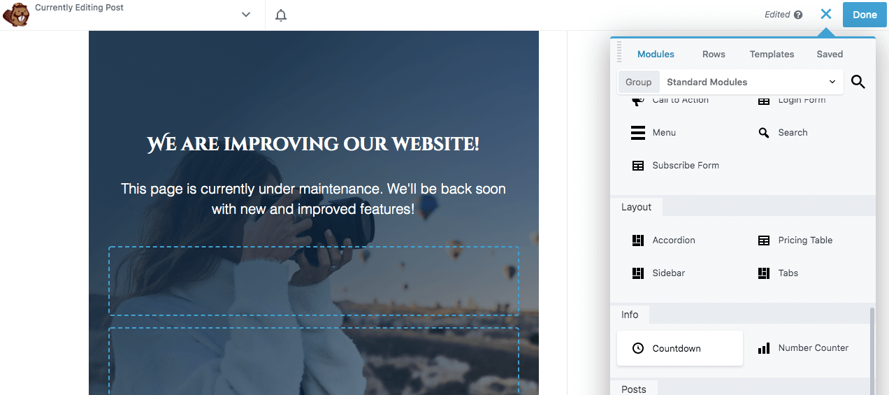 Beaver Builder Lite gives you everything you need to complete the above steps. This tool can be effective for building a simple maintenance page. However, you’ll need our premium plugin to access more advanced features such as a countdown timer or lead capture form.