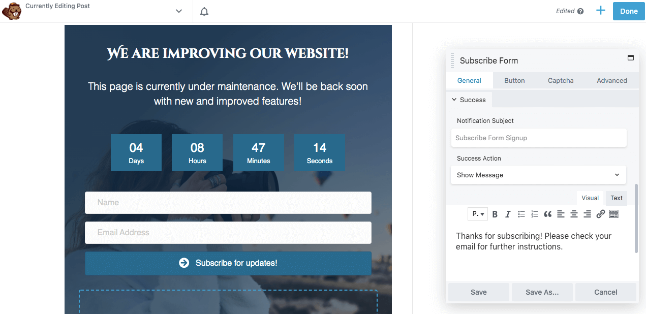 You might also want to capture leads using your maintenance mode page. This way, users can sign up for your newsletter and learn about planned updates.