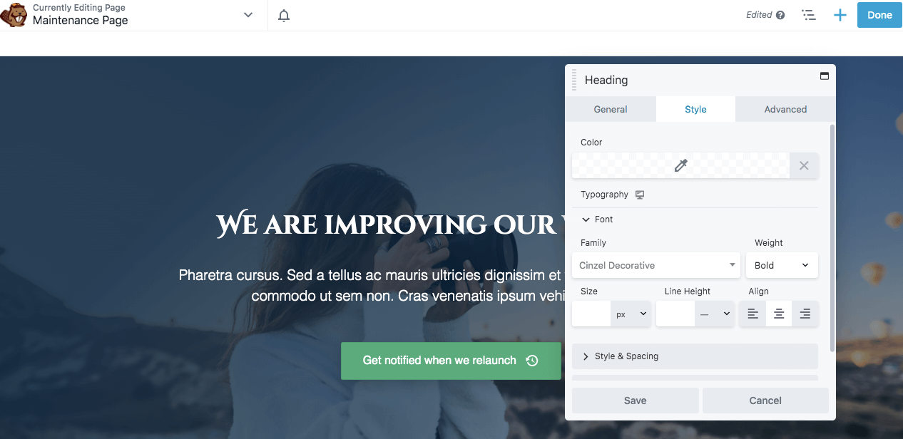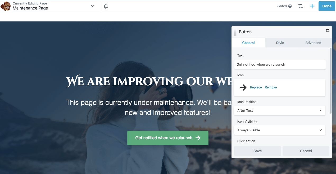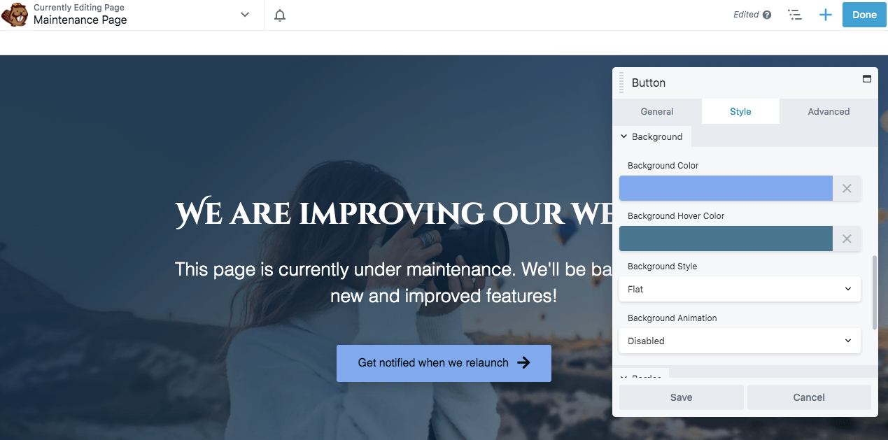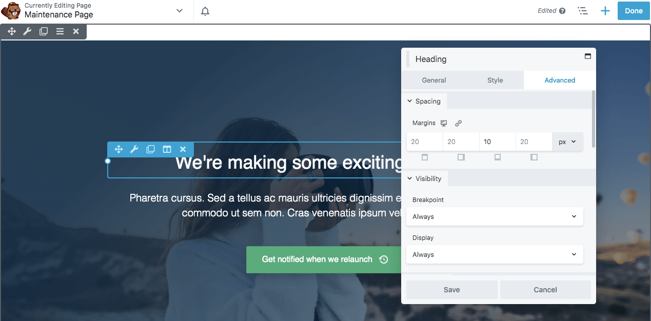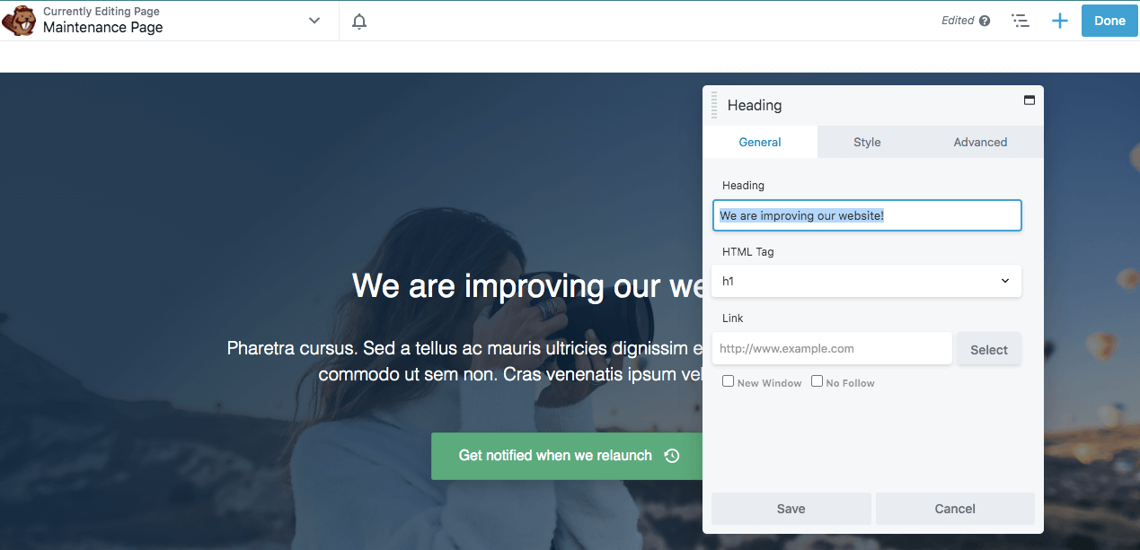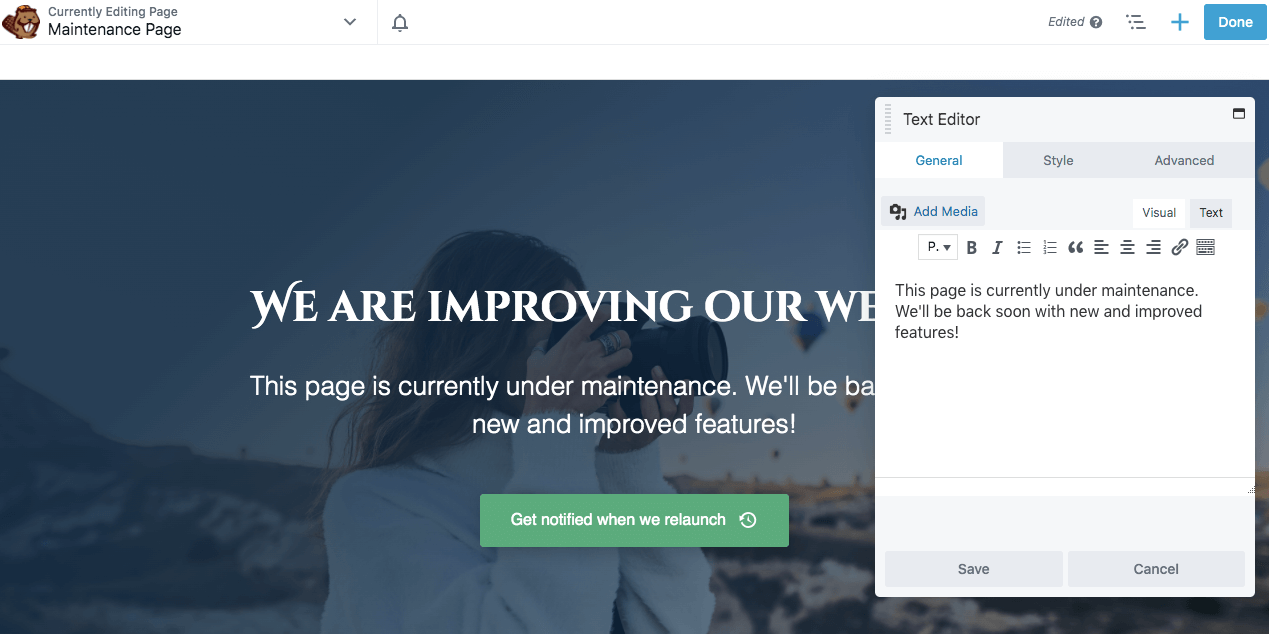 This will open the Beaver Builder editor, where you can start customizing your maintenance mode page.