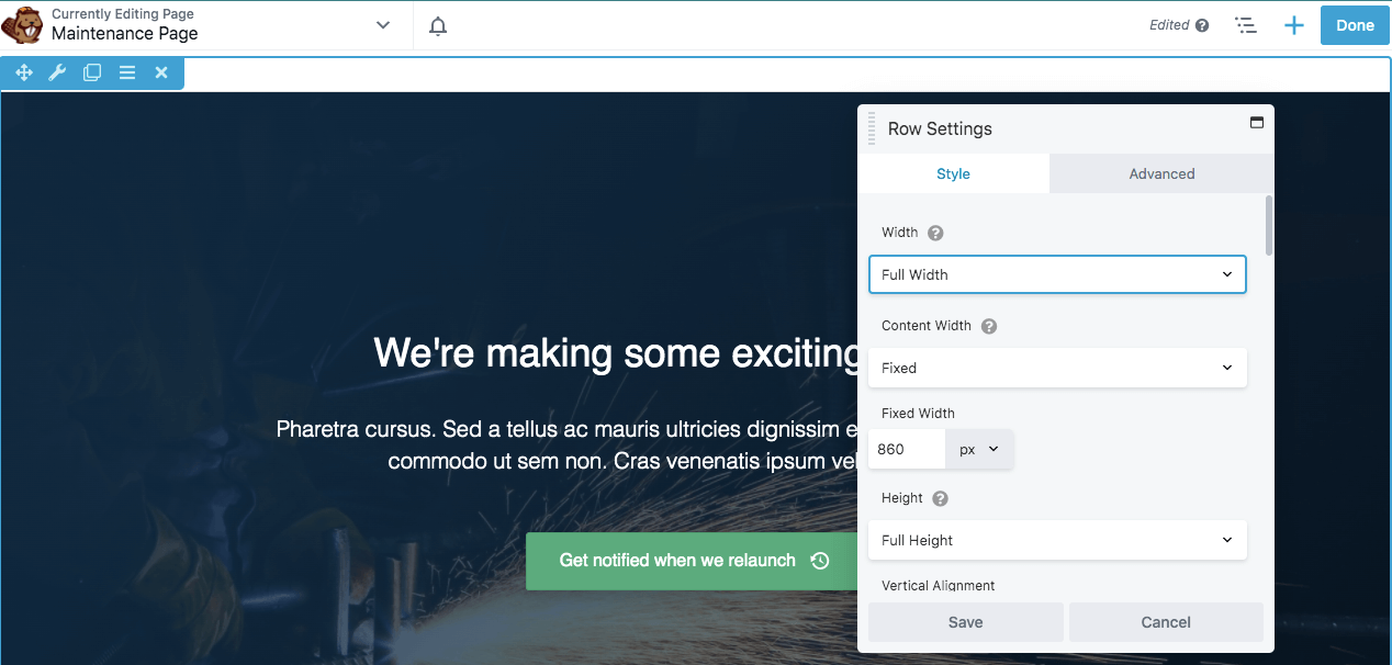 After inserting the Maintenance template, you’ll need to customize it and add relevant information to your website. If you’d like to change the background image, hover over it and click on the wrench icon to open up the Row Settings: