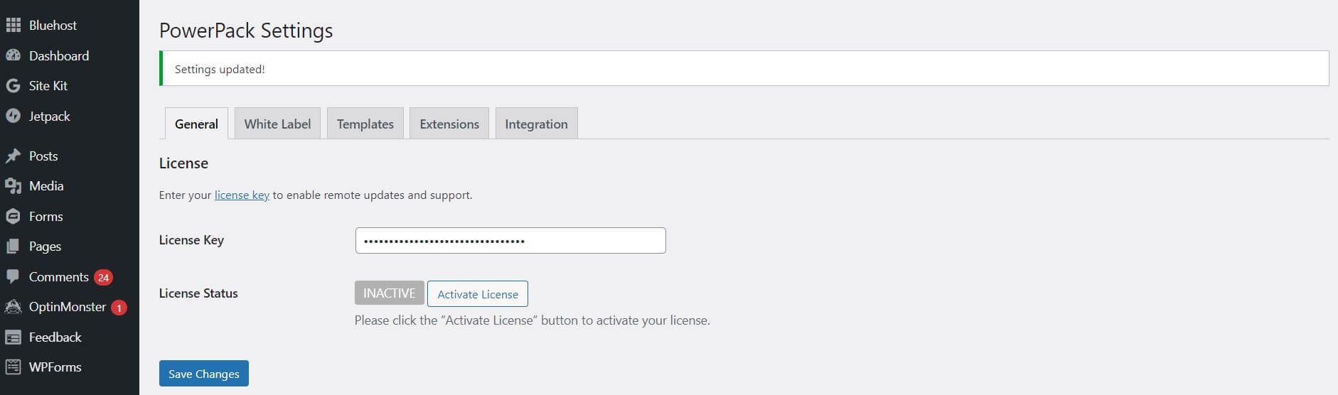 On the settings page, click the License tab in the side menu and paste the license key you copied earlier. Then click Save License Key: