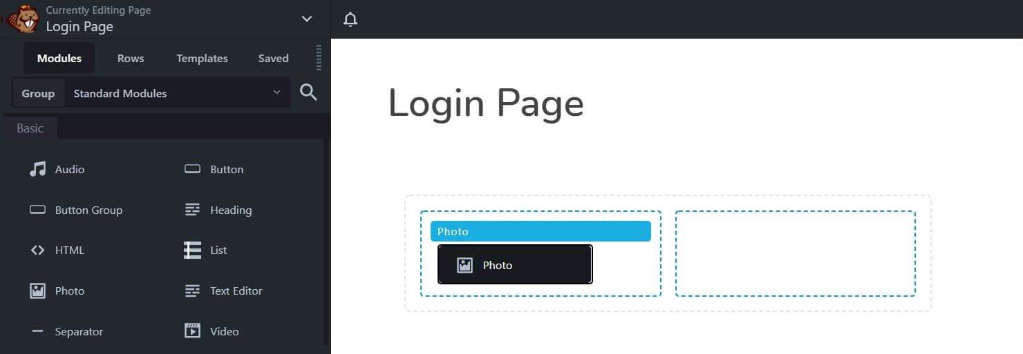 Now we’re going to add an image to the left column. Go to the Modules tab, select the Photo module, and drop it into the left column. In the Photo’s settings panel click Select Photo and upload an image you want to display on your login page: