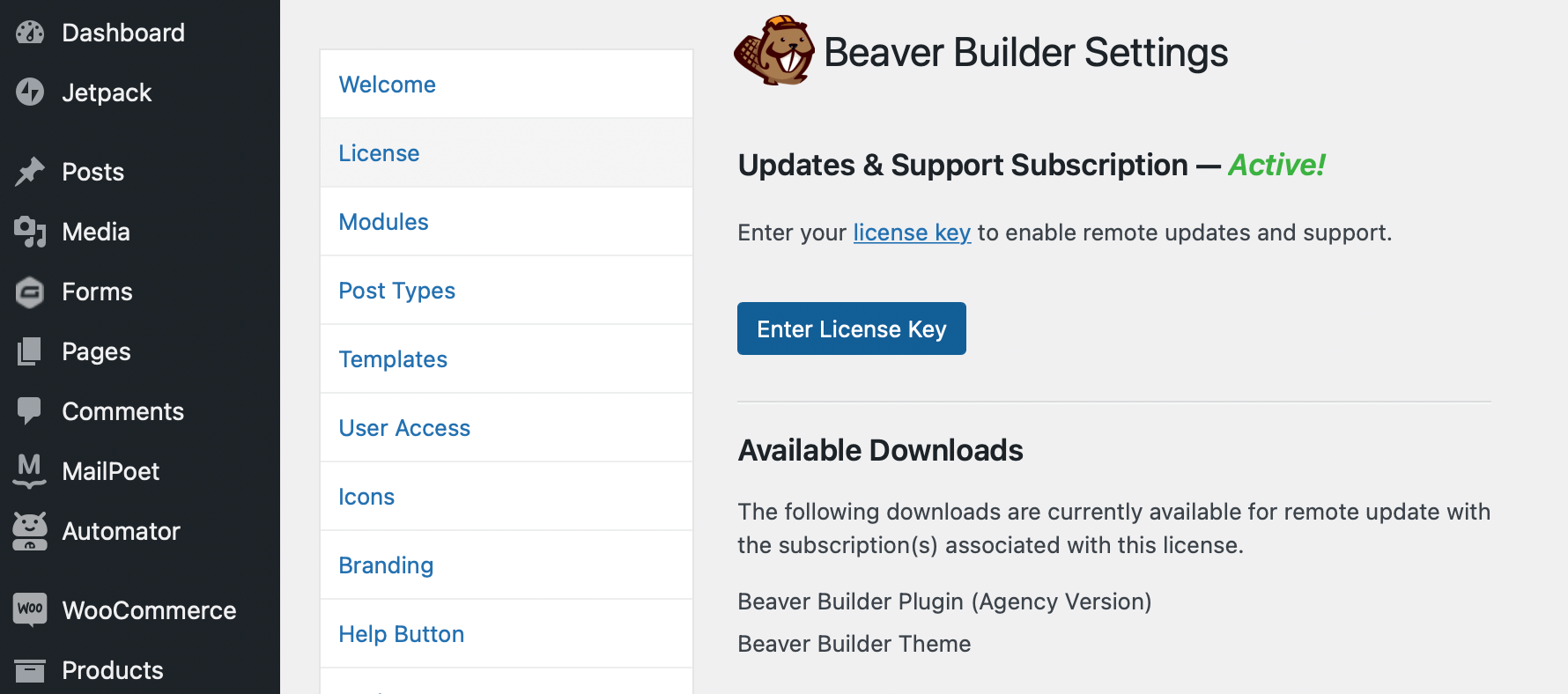 Navigate to Settings and scroll down to find Beaver Builder. Under License, you’ll need to paste your license key. You can find it by logging into your account: