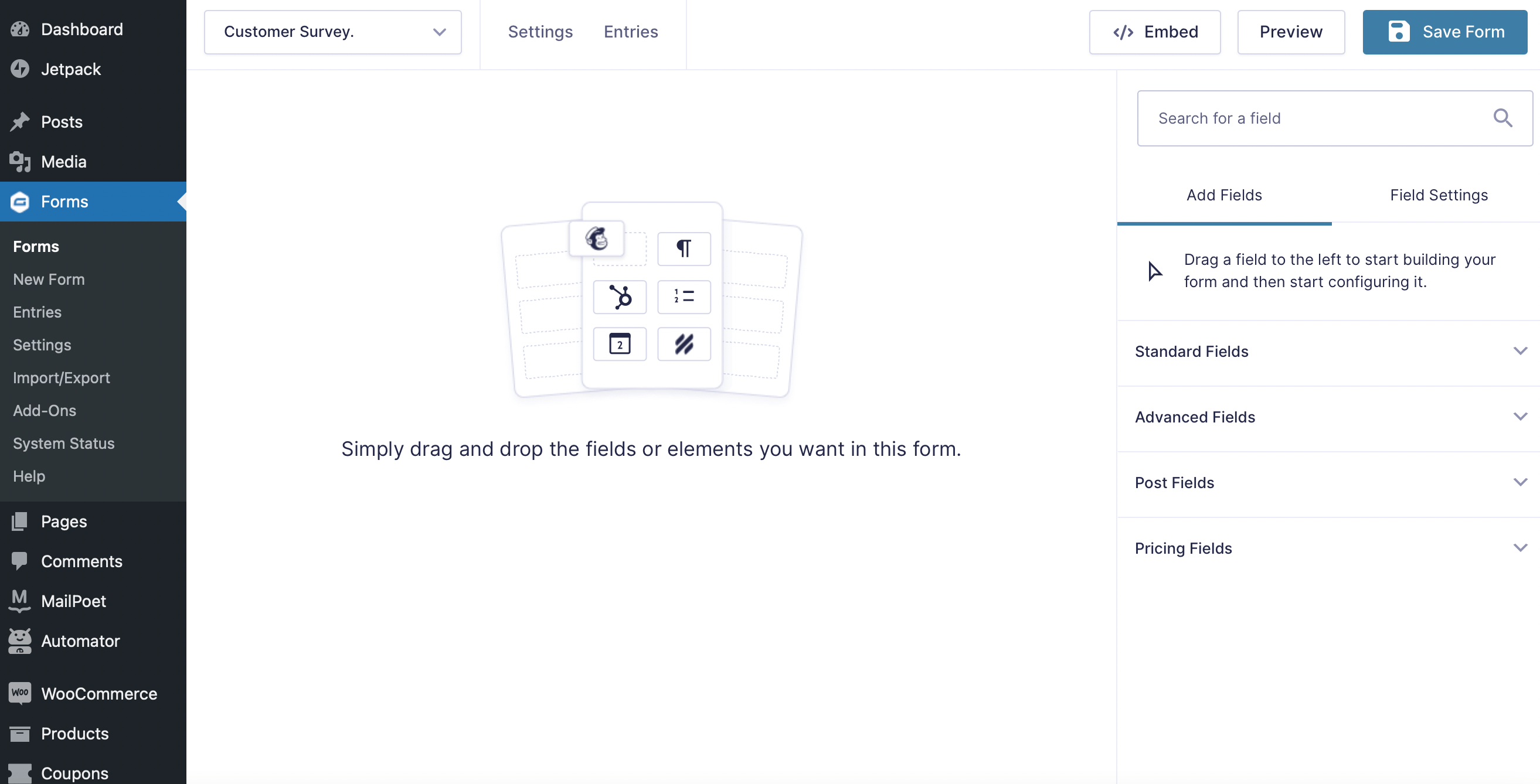 You should now arrive at the editing interface. Gravity Forms utilizes a drag-and-drop form builder, so you can start creating your survey using the fields to your right. There are Standard, Advanced, Post, and Pricing fields to customize your form: