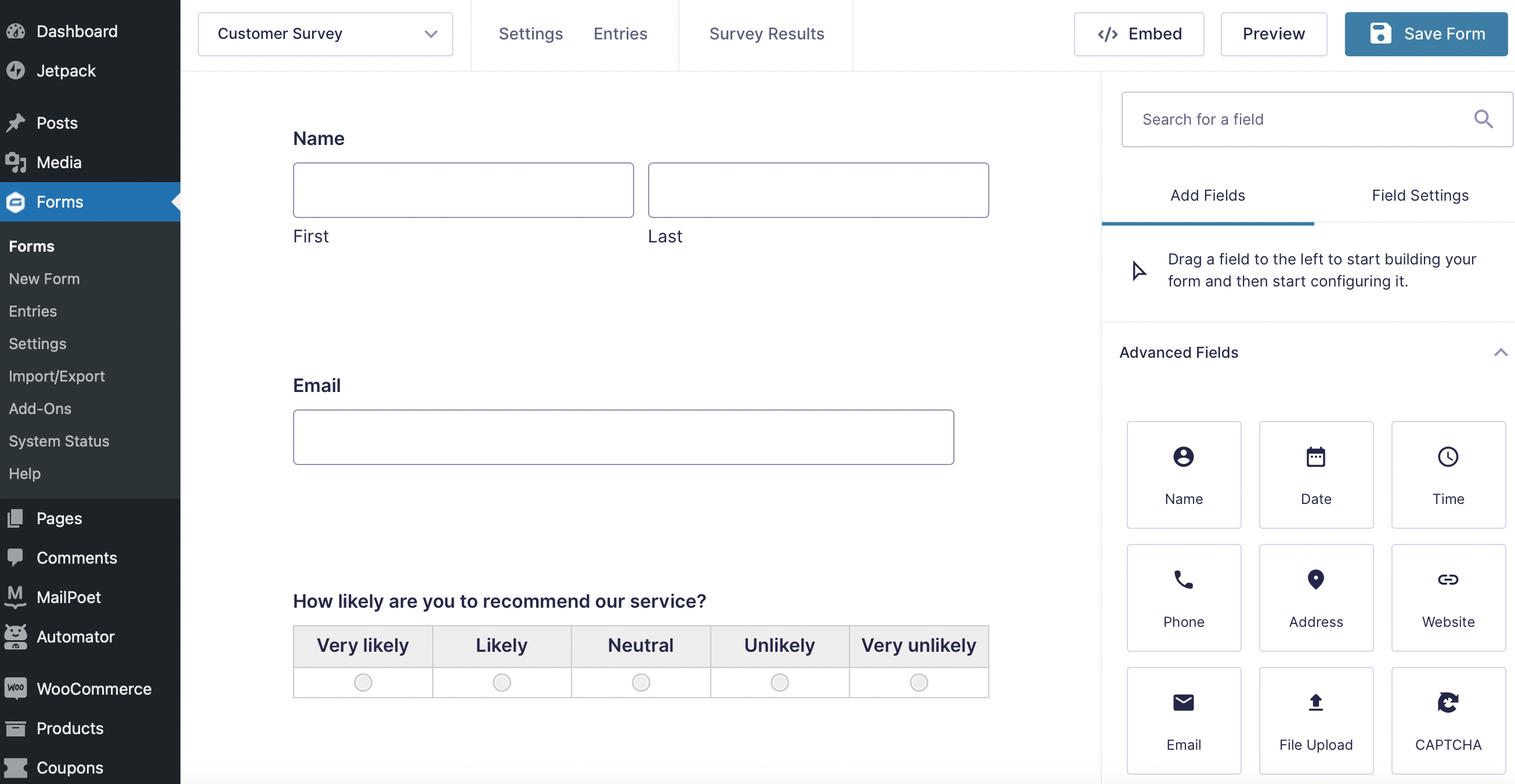 If you’re creating a customer survey for market research purposes, you may want to learn more about the users providing feedback. For example, you might choose to add a Name field and an Email field to your form. You can find these elements under Advanced Fields:
