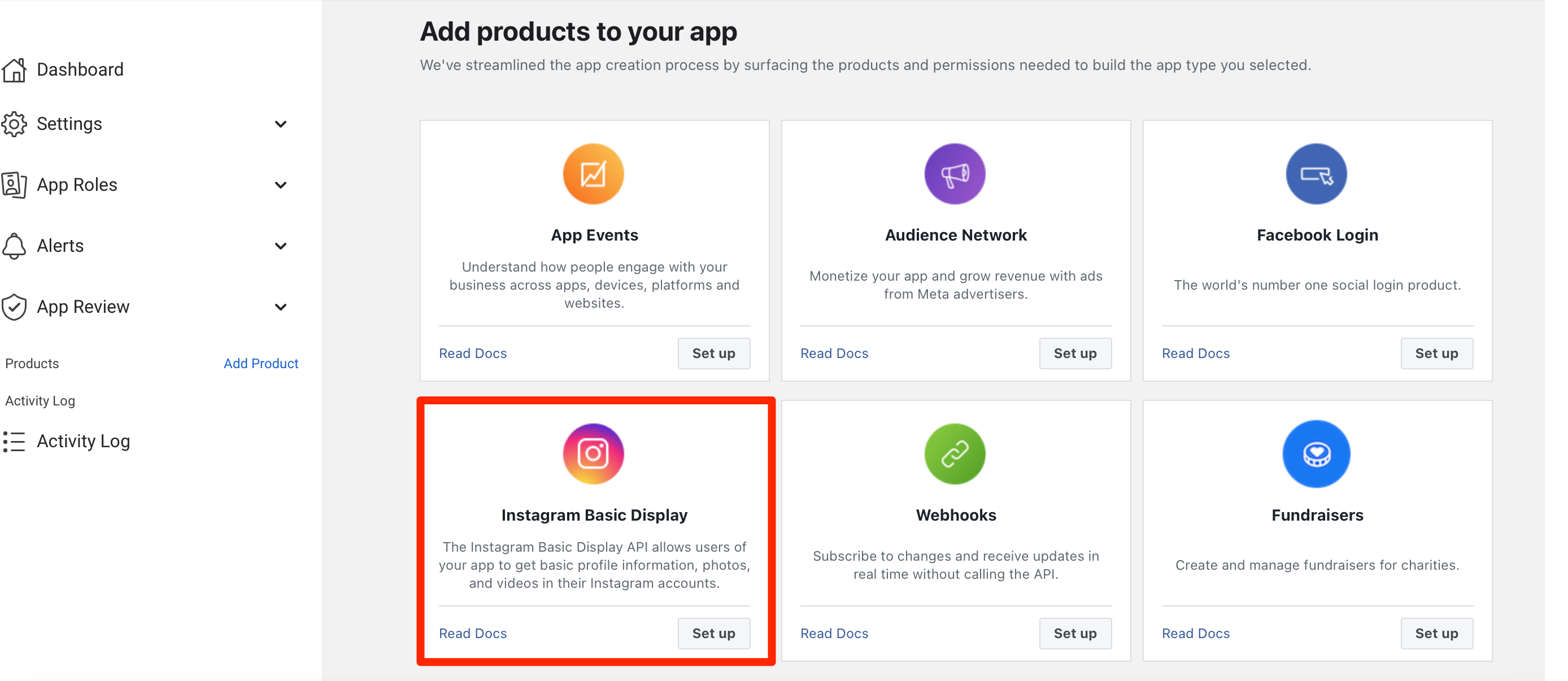 You will now see a list of all available apps like Facebook Login, Fundraisers, and Webhooks. Find the Instagram Basic Display option and click Set up: