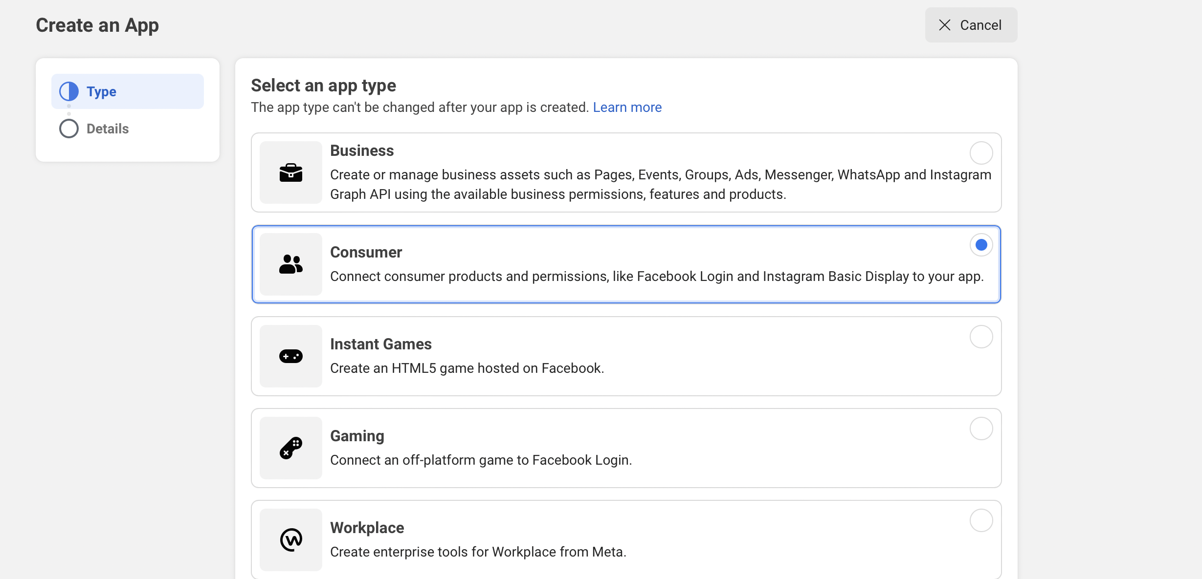 Select Create App, and you’ll be taken to a new screen. Here, choose Consumer and then hit Next: