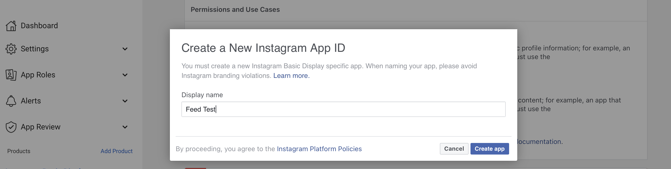 It’s a good idea to visit the link provided in the popup to avoid Instagram branding violations. Then, in the Display name box, enter a new Instagram app ID and hit Create app.