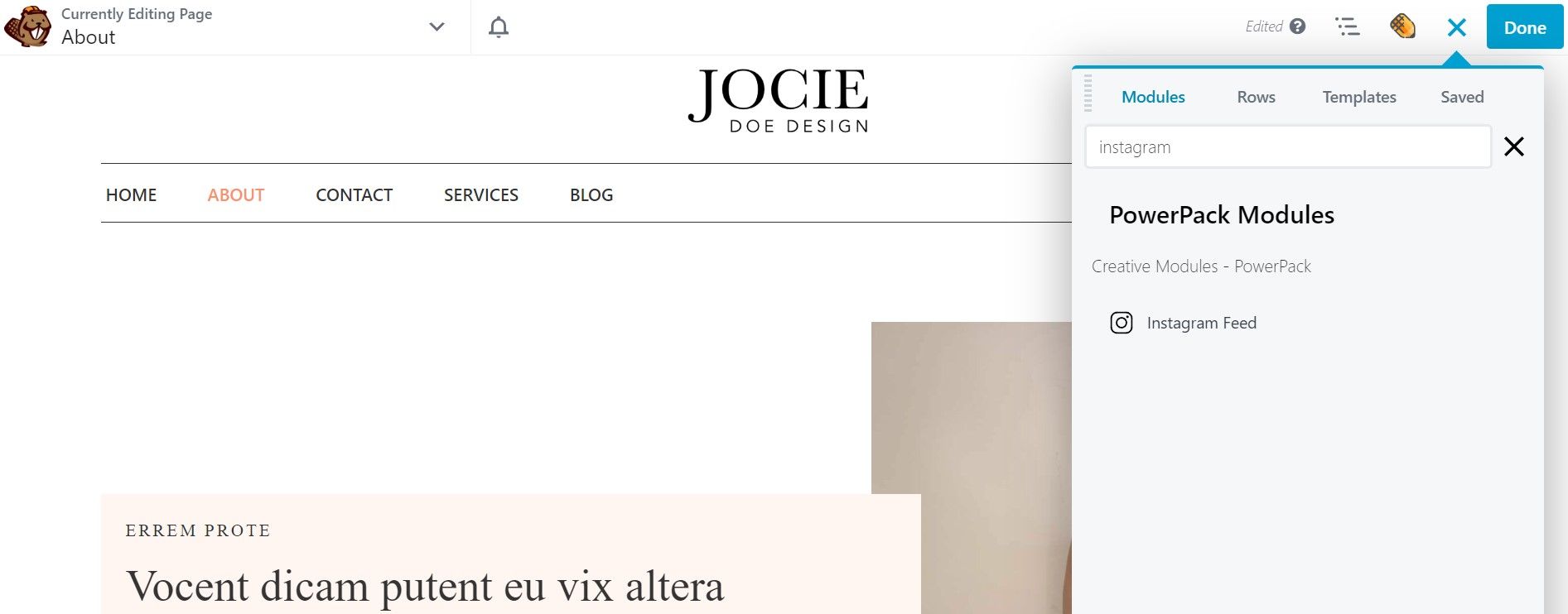It’s now time to add the Instagram feed to your page or post in WordPress. Launch the Beaver Builder editor and access the modules via the sidebar. Then, select the PowerPack Instagram Feed module and drag it onto your page: