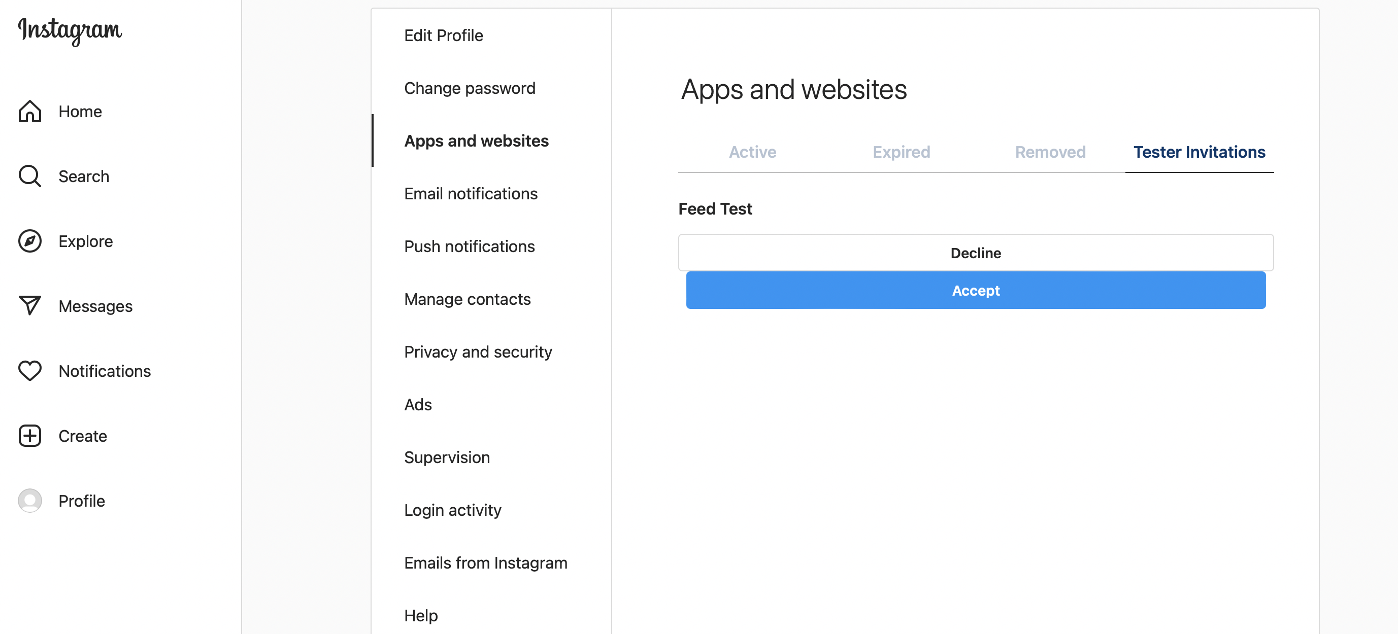 Now, you’ll need to accept the invitation, so head across to your Instagram account. Go to Settings > Apps and websites > Tester Invitations: