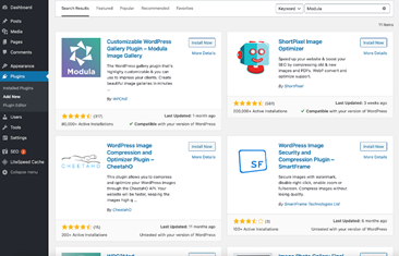 If you want to try the free version, a simple search for “Modula” in the Plugins section of your WordPress dashboard will suffice.