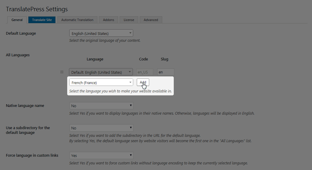 This adds a Translate Page/Site menu item to the WordPress admin bar at the top of the screen. Hover over it to access a link to the plugin’s Settings page. You can also go to Settings > TranslatePress.