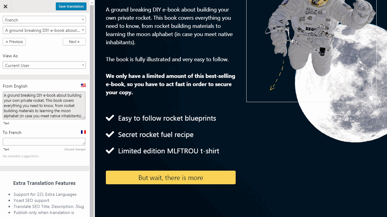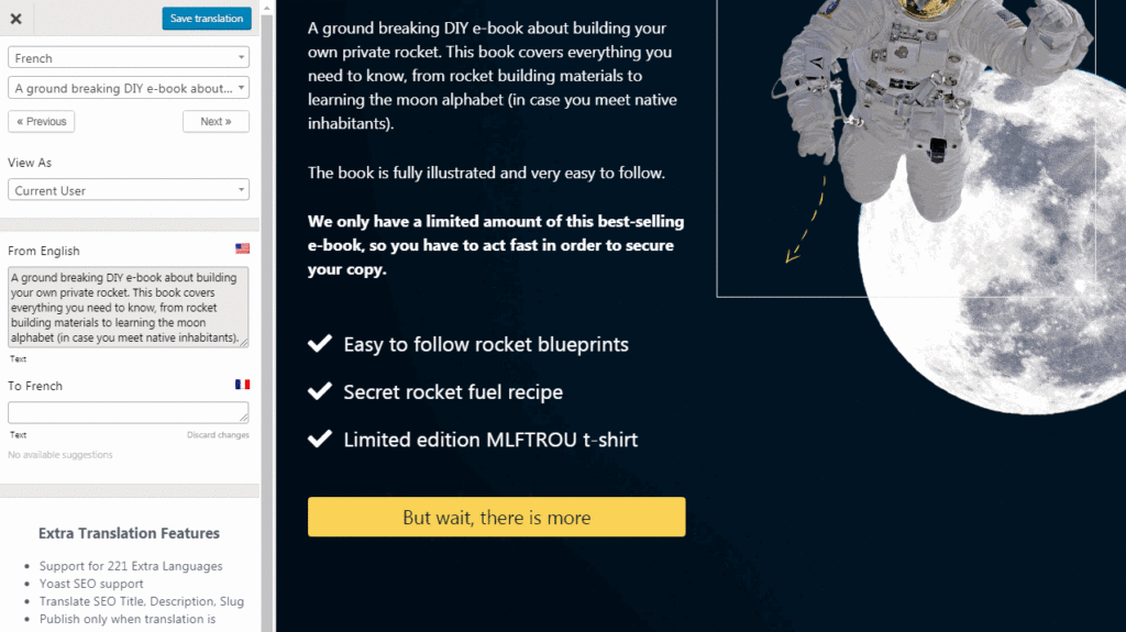 This front-end editor recognizes many types of elements with text, including images with text, sliders, forms, and even popups. If you have a WooCommerce store, TranslatePress makes it easy to translate WooCommerce products.